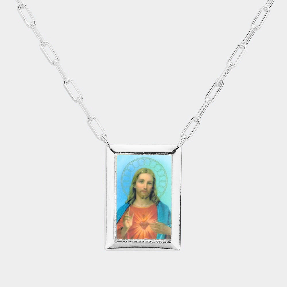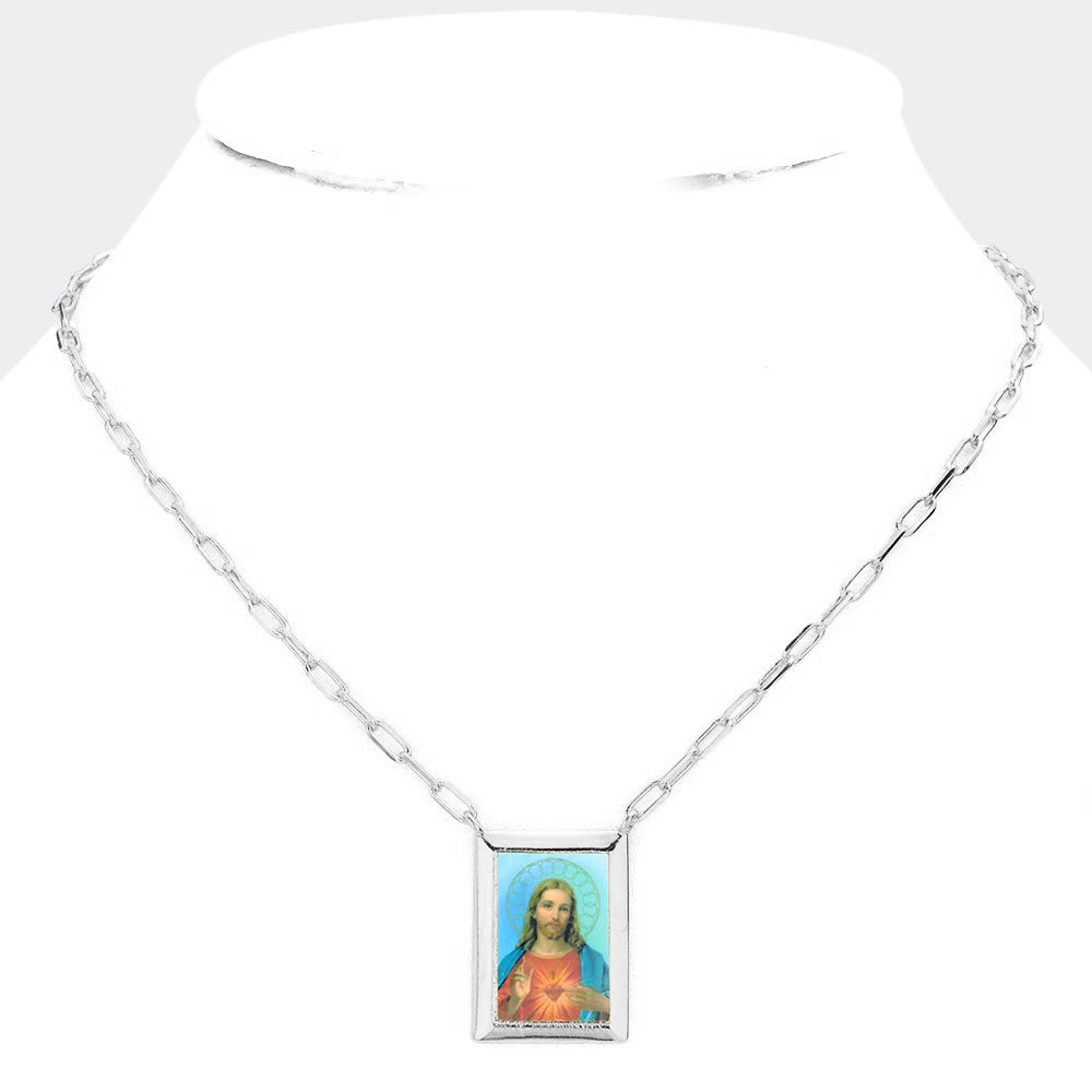 White Gold Dipped Brass Metal Sacred Heart of Jesus Pendant Necklace