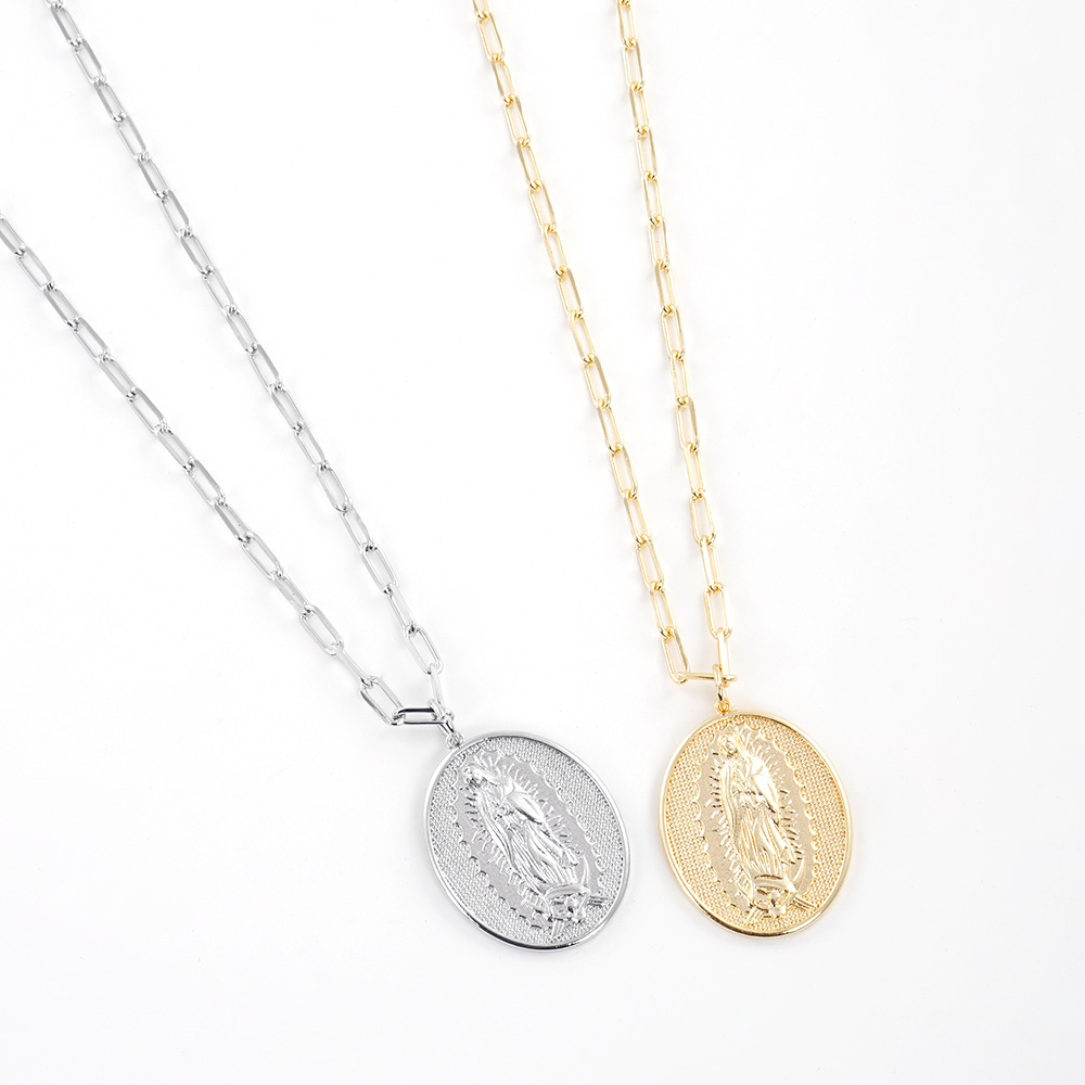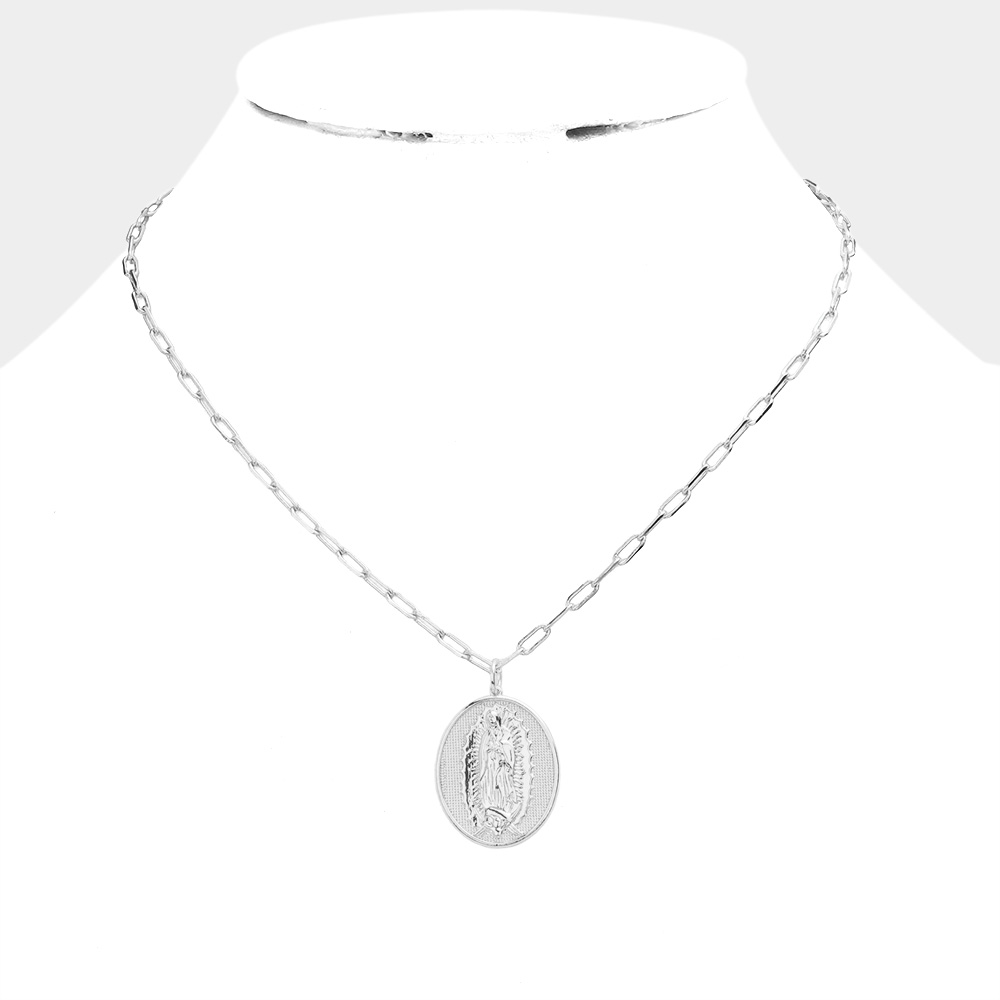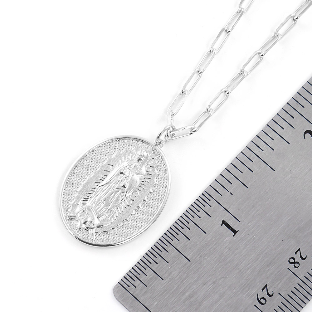 White Gold Dipped Brass Metal Virgin Mary Pendant Necklace