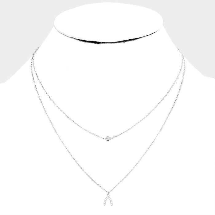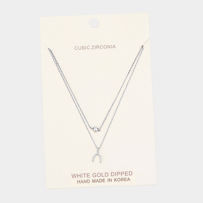 White Gold Dipped Cubic Zirconia CZ Wishbone Pendant Necklace