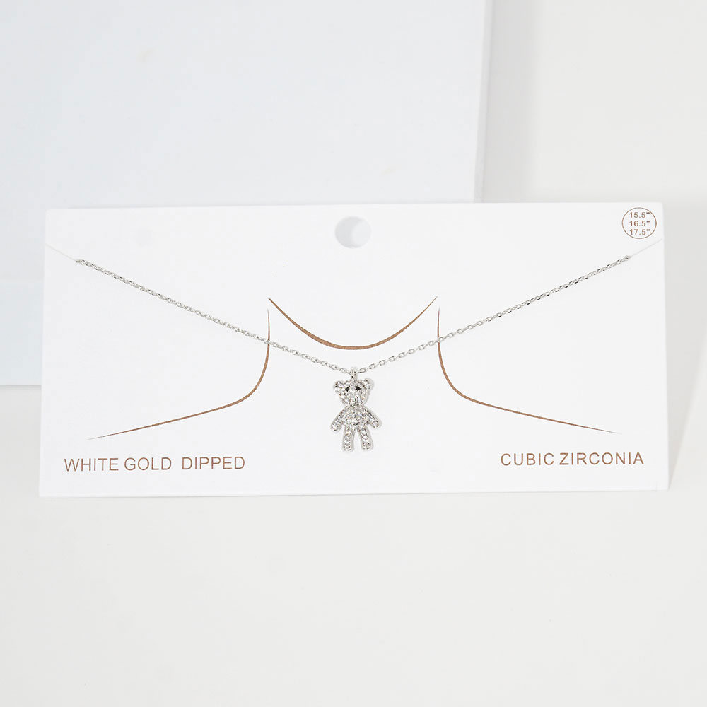 White Gold Dipped CZ Embellished Bear Pendant Necklace