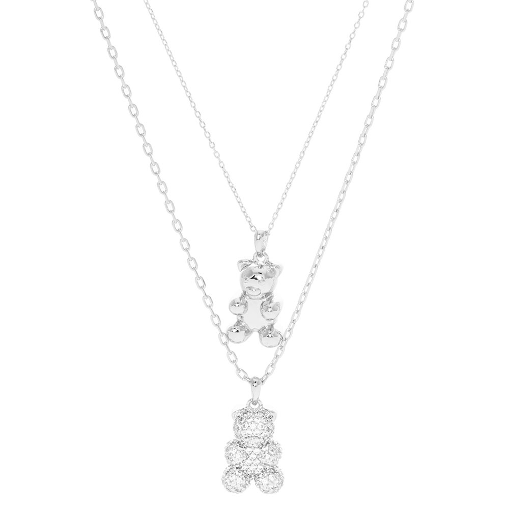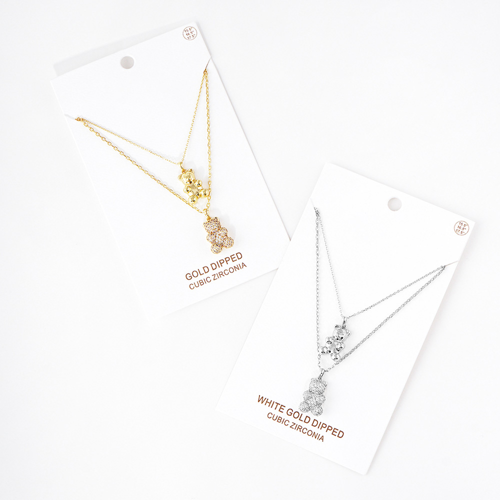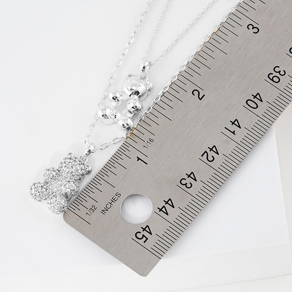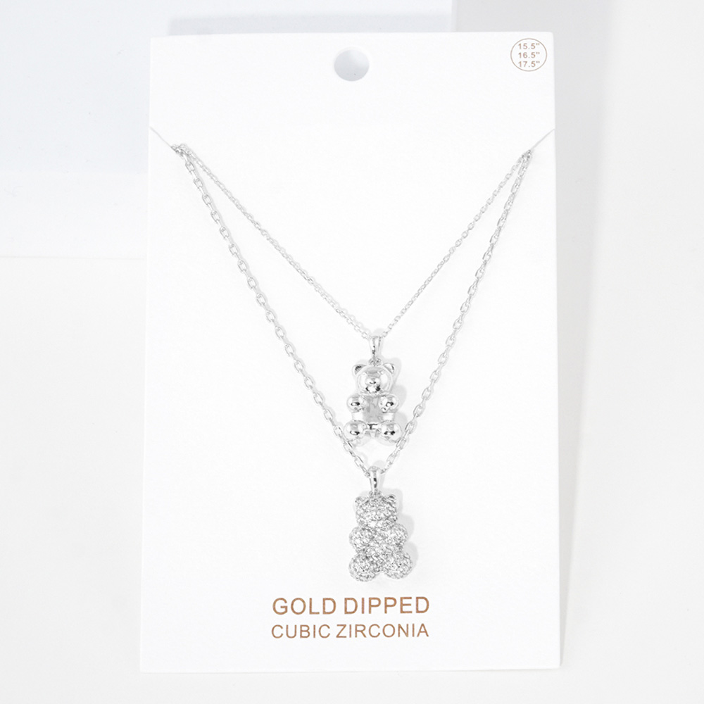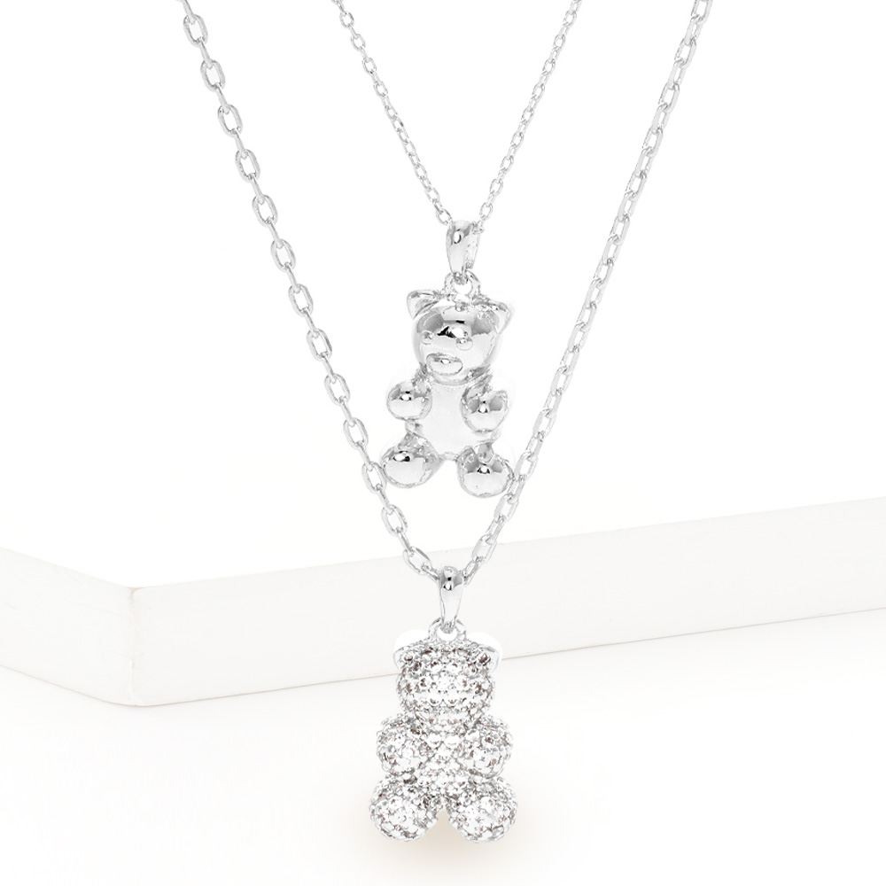 White Gold Dipped CZ Embellished Metal Bear Pendant Double Layered Necklace