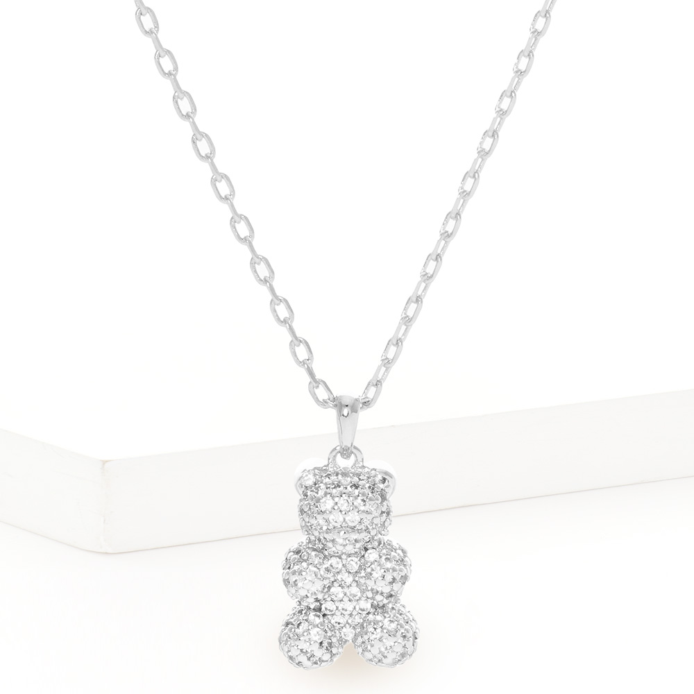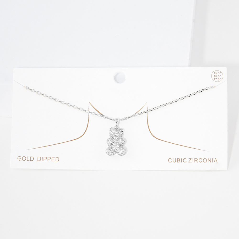 White Gold Dipped CZ Embellished Metal Bear Pendant Necklace