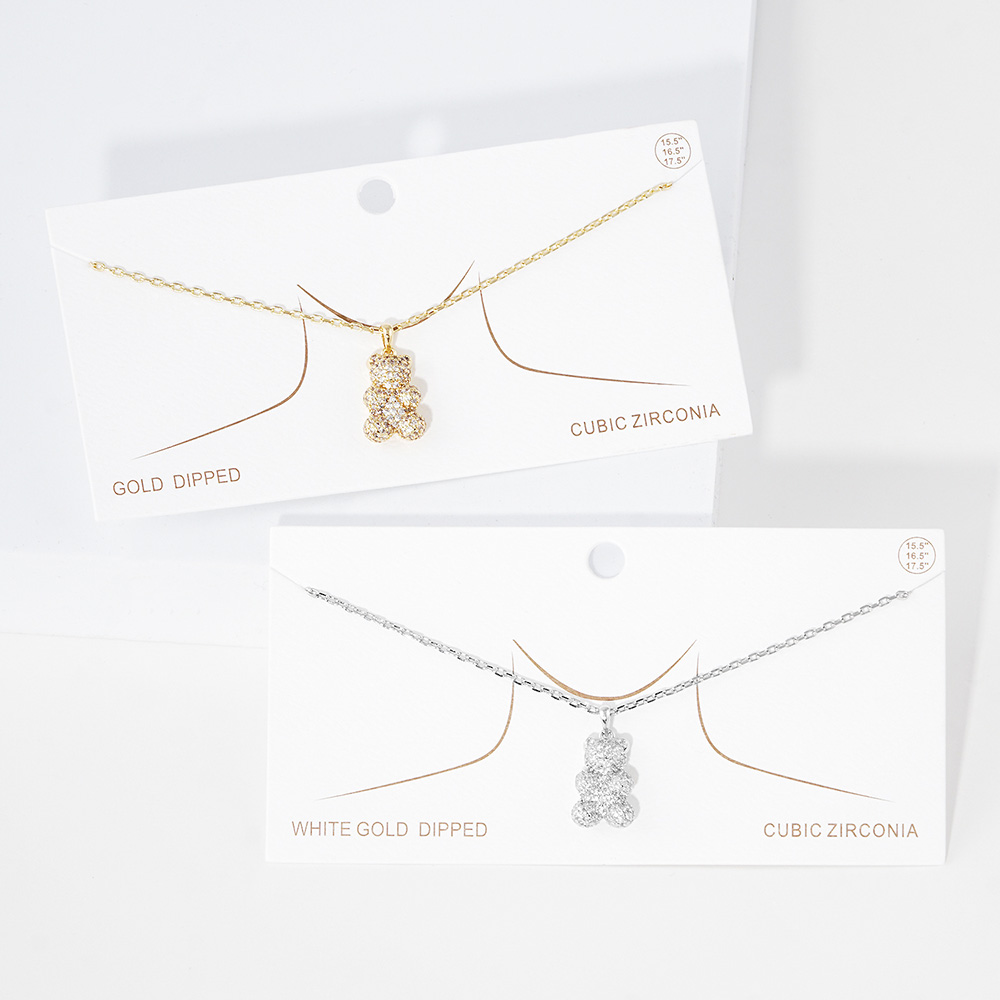 White Gold Dipped CZ Embellished Double Metal Bear Pendant Necklace