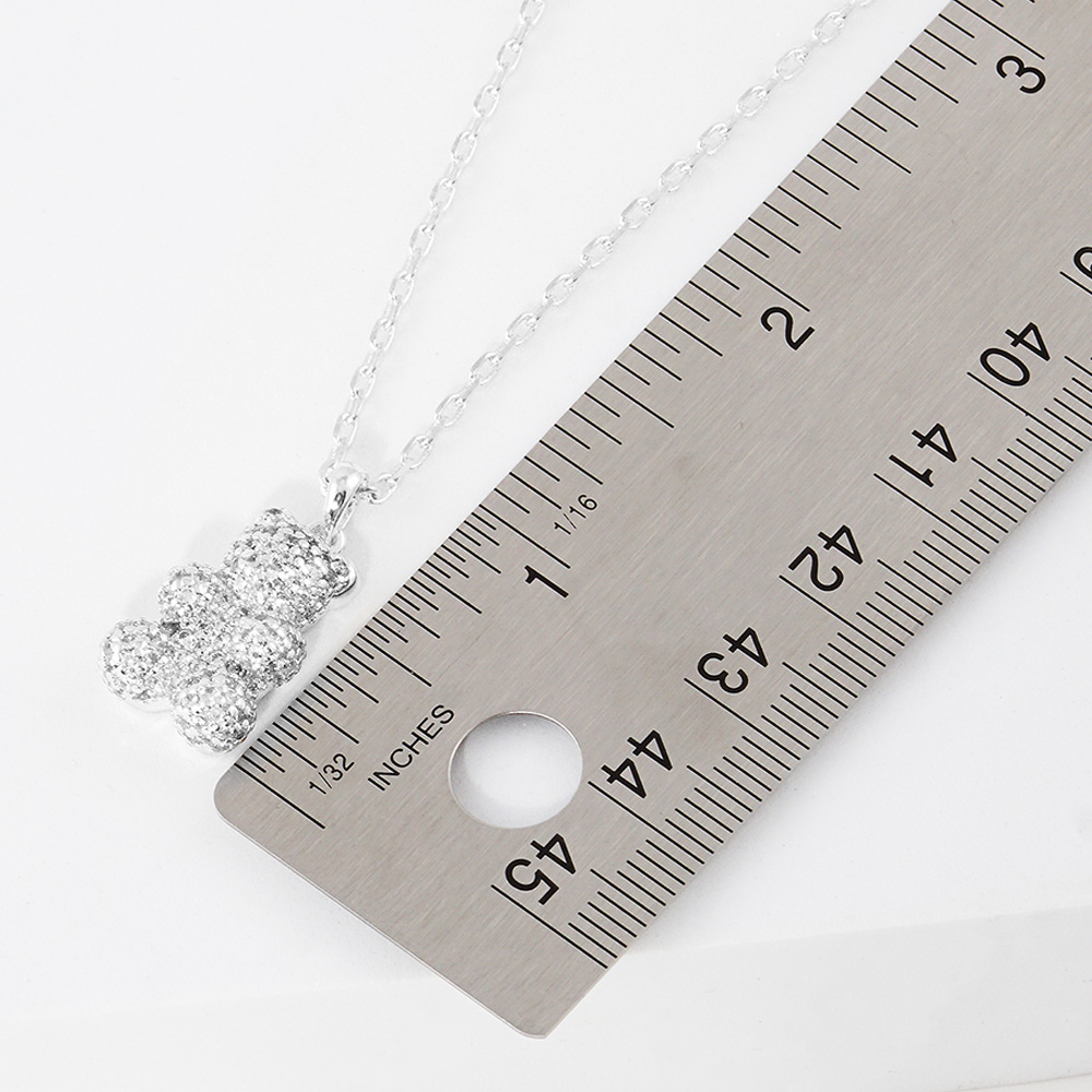 White Gold Dipped CZ Embellished Metal Bear Pendant Double Layered Necklace