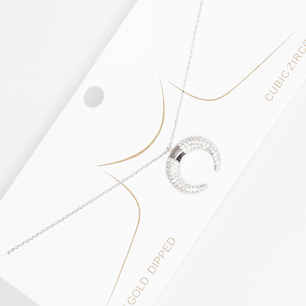 White Gold Dipped CZ Embellished Metal Horn Pendant Necklace