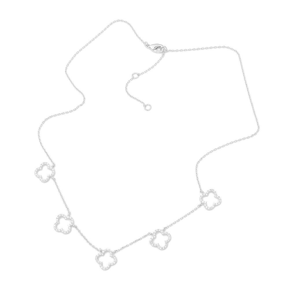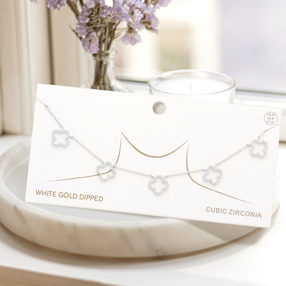 White Gold Dipped CZ Quatrefoil Pendant Station Necklace