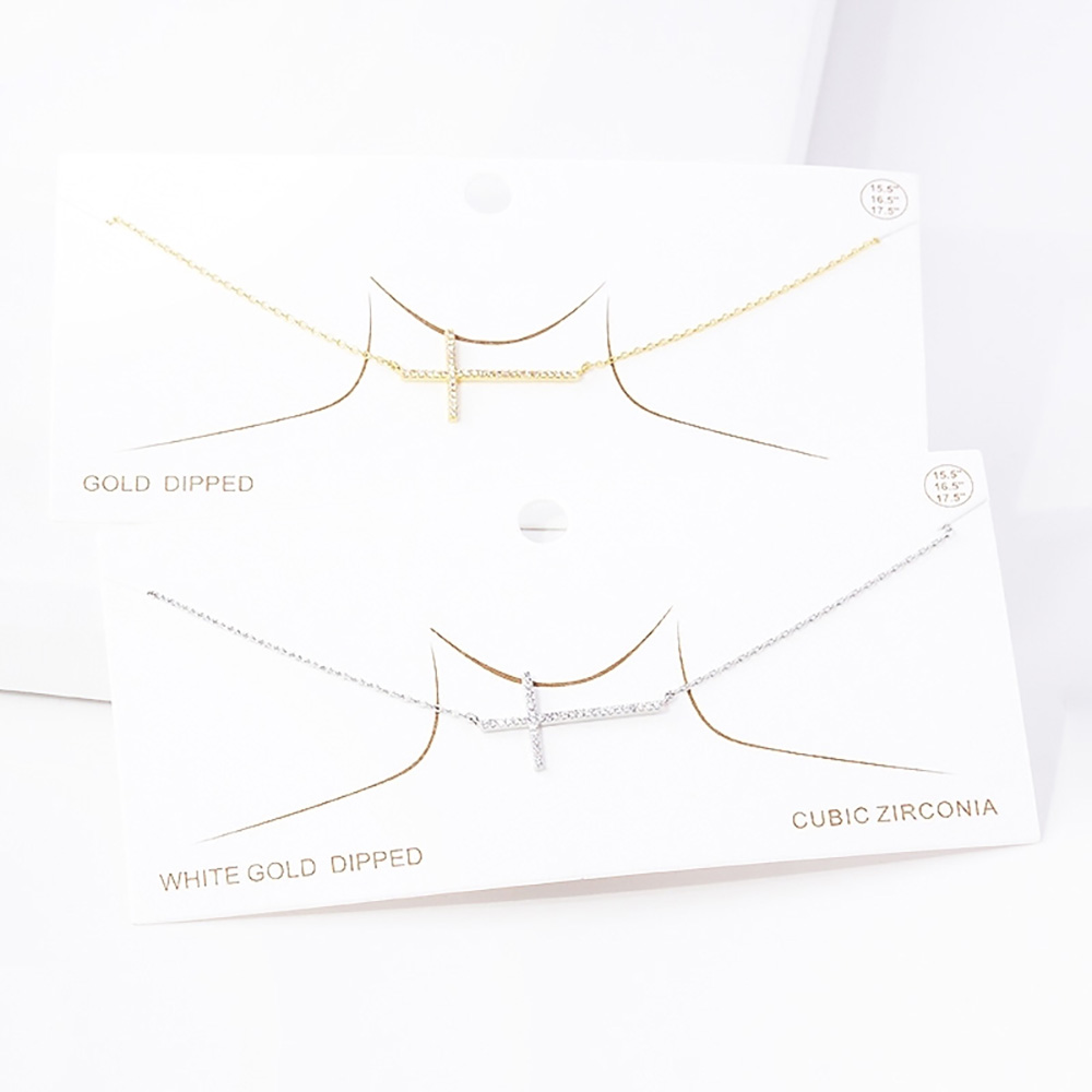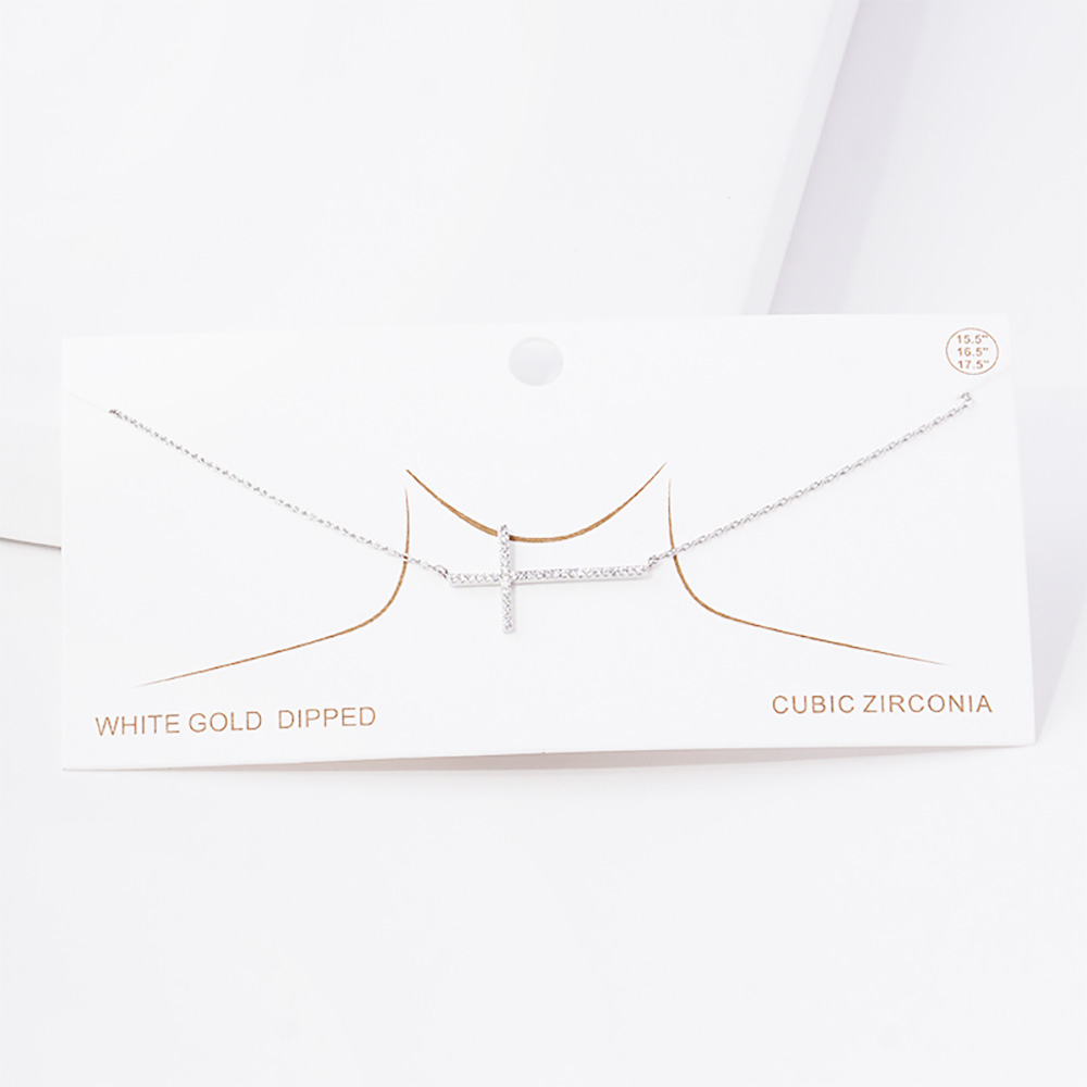Details • Necklace Size : 16" + 2" L • Pendant Size : 1.1" X 0.6" • Showcase faith and elegance with this sideways cross necklace, accented with sparkling cubic zirconia stones. A meaningful yet stylish pendant that blends spiritual symbolism with modern fashion, perfect for daily wear or as a thoughtful gift for someone special. • Lead and Nickel Compliant • Made In Korea • Gold Dipped • CZ Cubic Zirconia