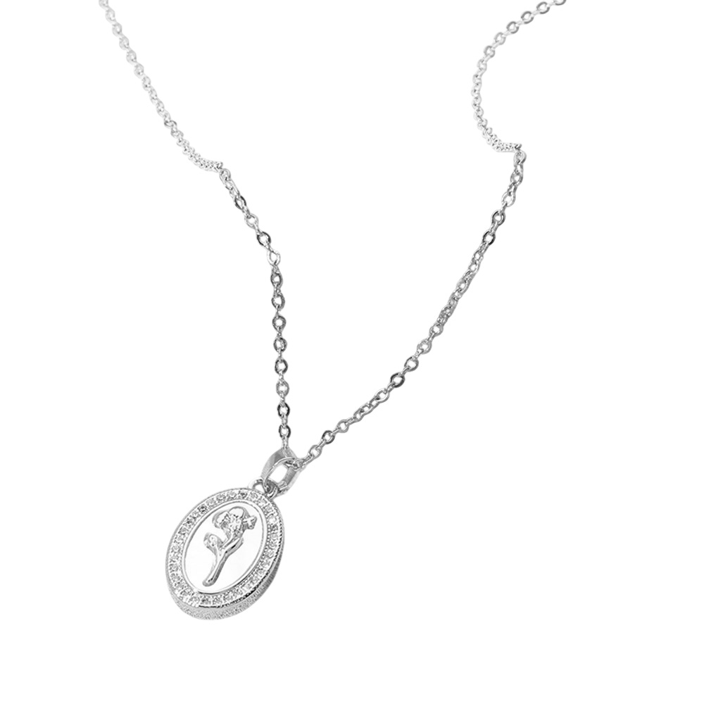 White Gold Dipped CZ Stone Paved Tulip Flower Embossed Mother of Pearl Oval Pendant Necklace