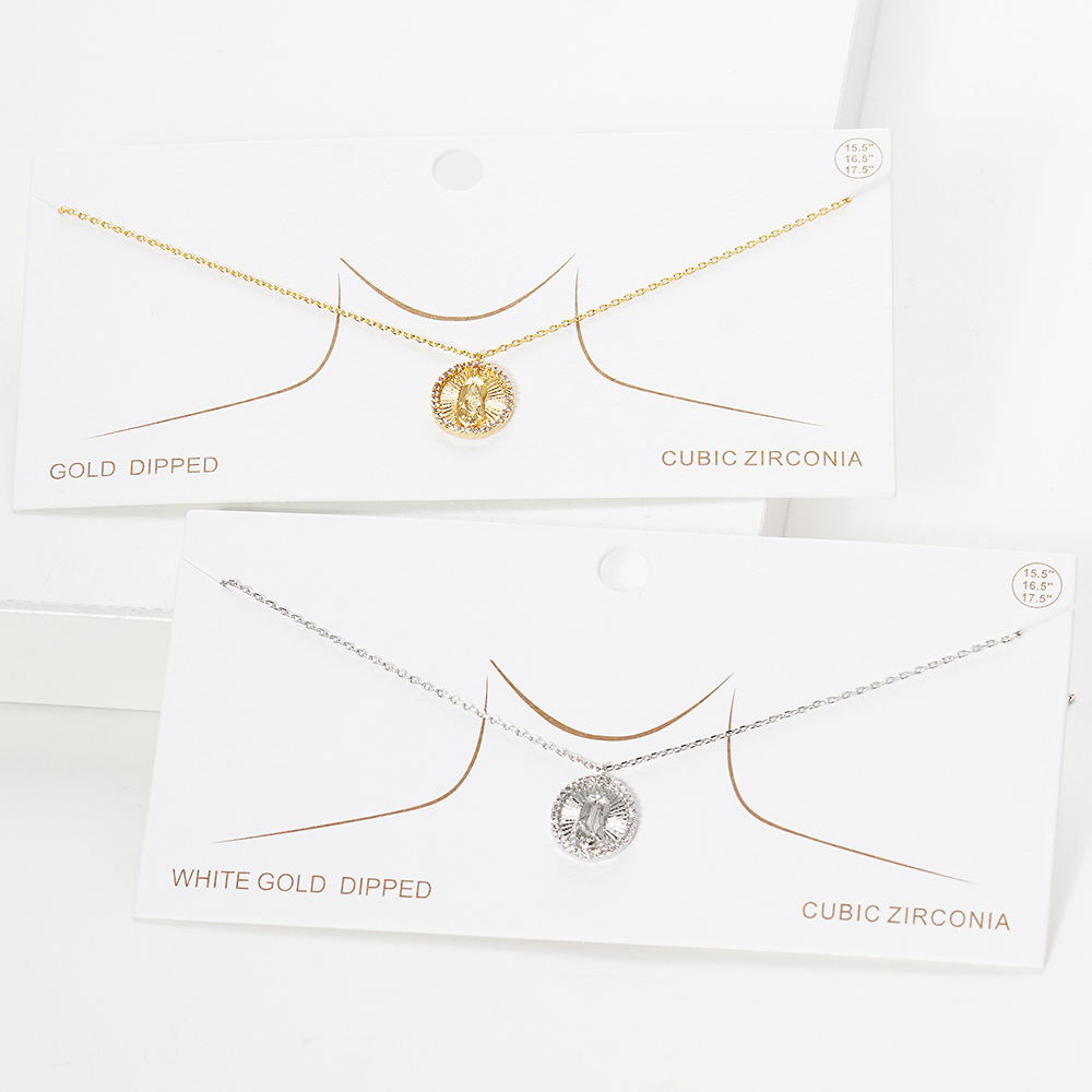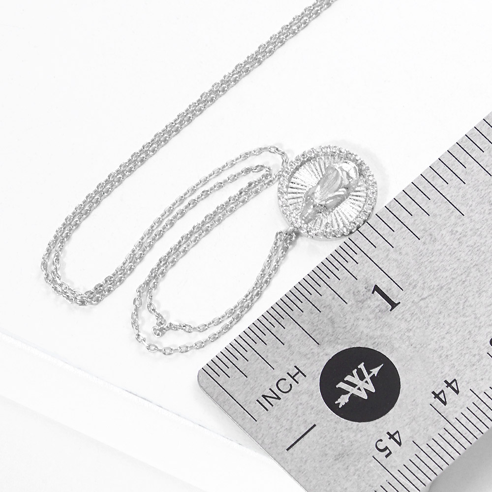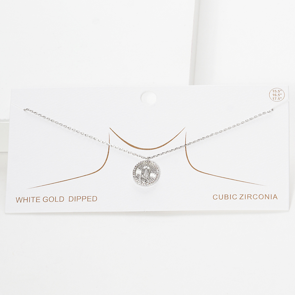 White Gold Dipped CZ Trimmed Virgin Mary Metal Round Pendant Necklace