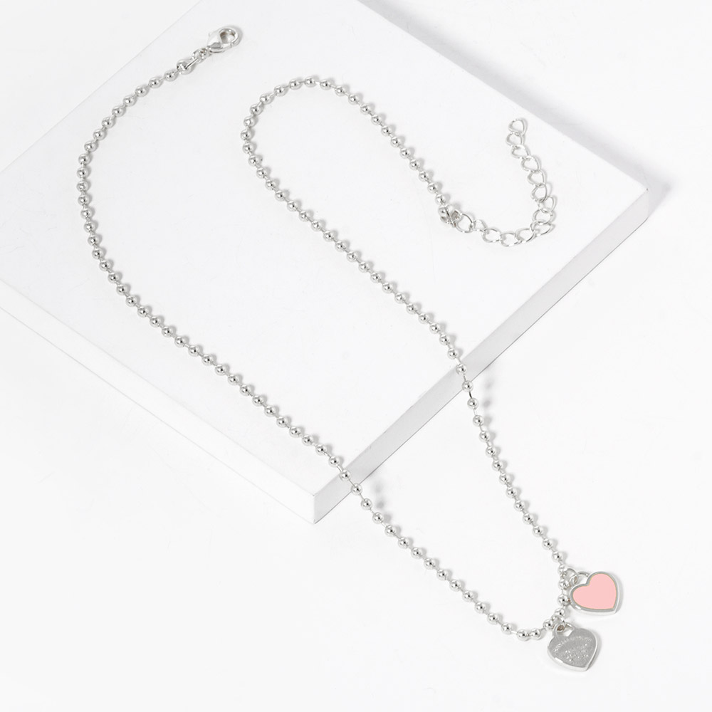 White Gold Dipped Double Heart Pendant Bubble Chain Necklace