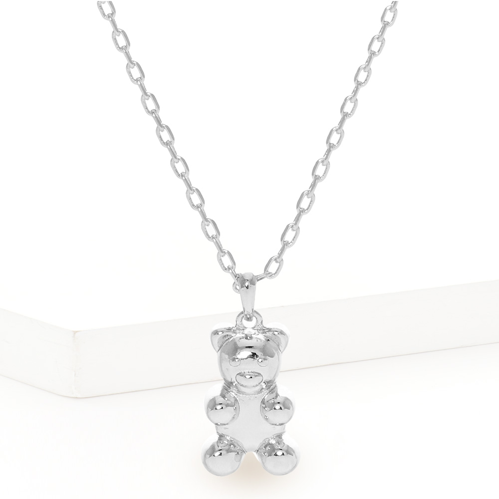 White Gold Dipped CZ Embellished Metal Bear Pendant Necklace