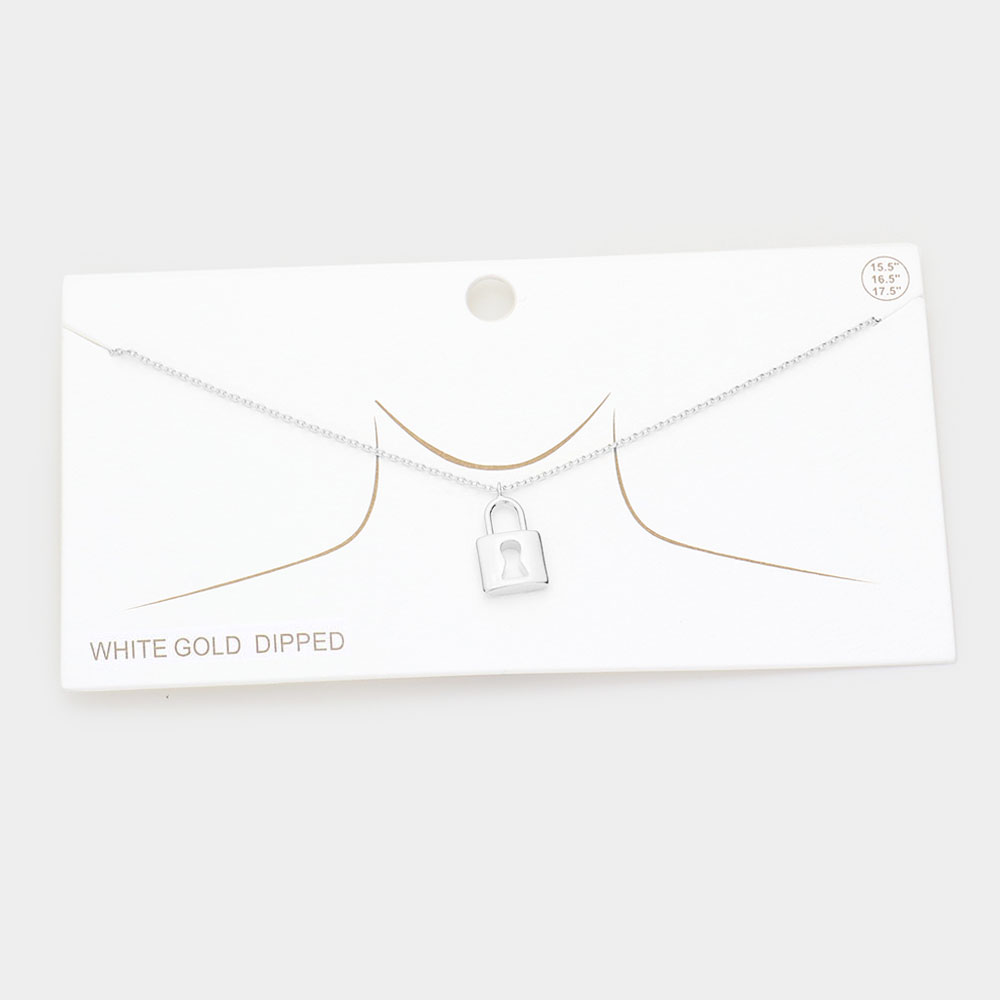 White Gold Dipped CZ Stone Embellished Key Lock Pendant Necklace