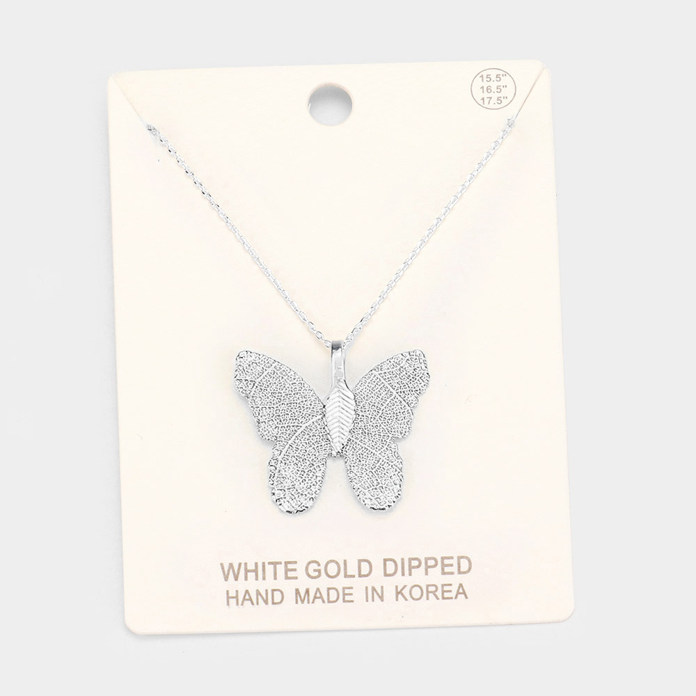 White Gold Dipped Textured Butterfly Pendant Necklace