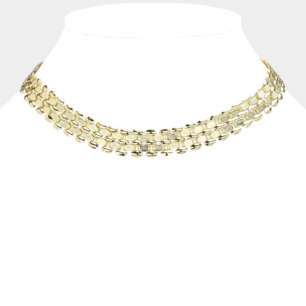 Details • Necklace Size : 14.5" + 3.25" L • Decor Size : 0.5" L • Sleek chain link choker necklace with a layered design that adds a refined yet modern touch. Perfect for pairing with casual or evening looks, this versatile piece offers timeless elegance and contemporary edge, making it an essential accessory for chic styling. • Lead and Nickel Compliant