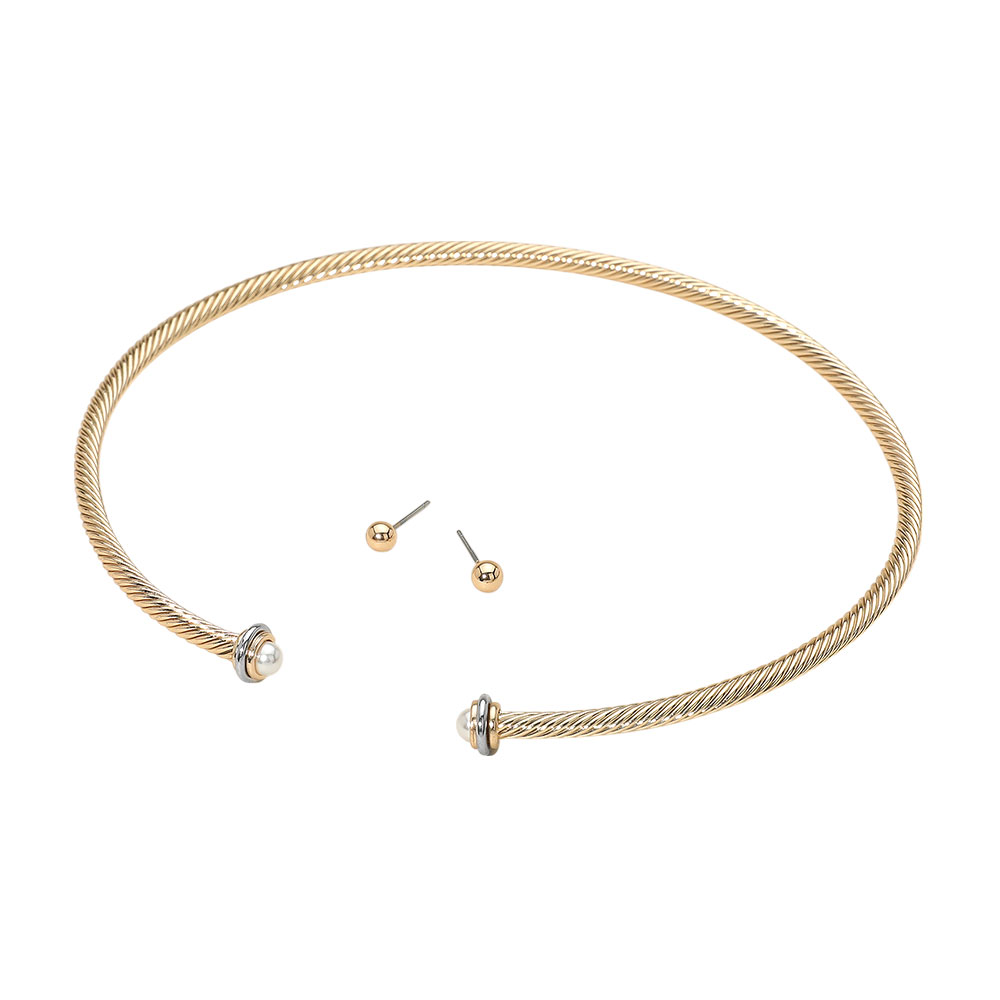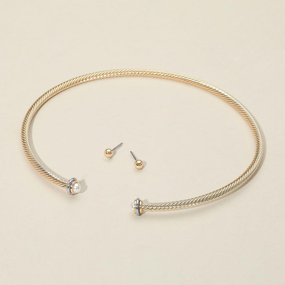 Details • Size : 15" L, 4.75" D • Decor Size : 0.4" L • Earrings Size : 0.1" L • Elegant twisted wire choker necklace set featuring a polished finish and pearl-accented end caps. Includes matching stud earrings. Perfect for adding modern flair to any outfit. • Lead and Nickel Compliant