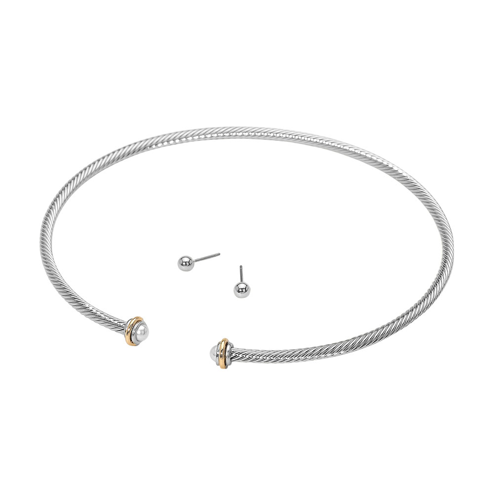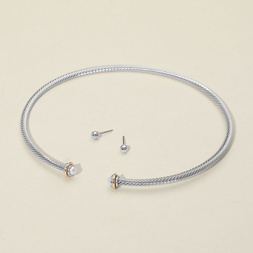Details • Size : 15" L, 4.75" D • Decor Size : 0.4" L • Earrings Size : 0.1" L • Elegant twisted wire choker necklace set featuring a polished finish and pearl-accented end caps. Includes matching stud earrings. Perfect for adding modern flair to any outfit. • Lead and Nickel Compliant