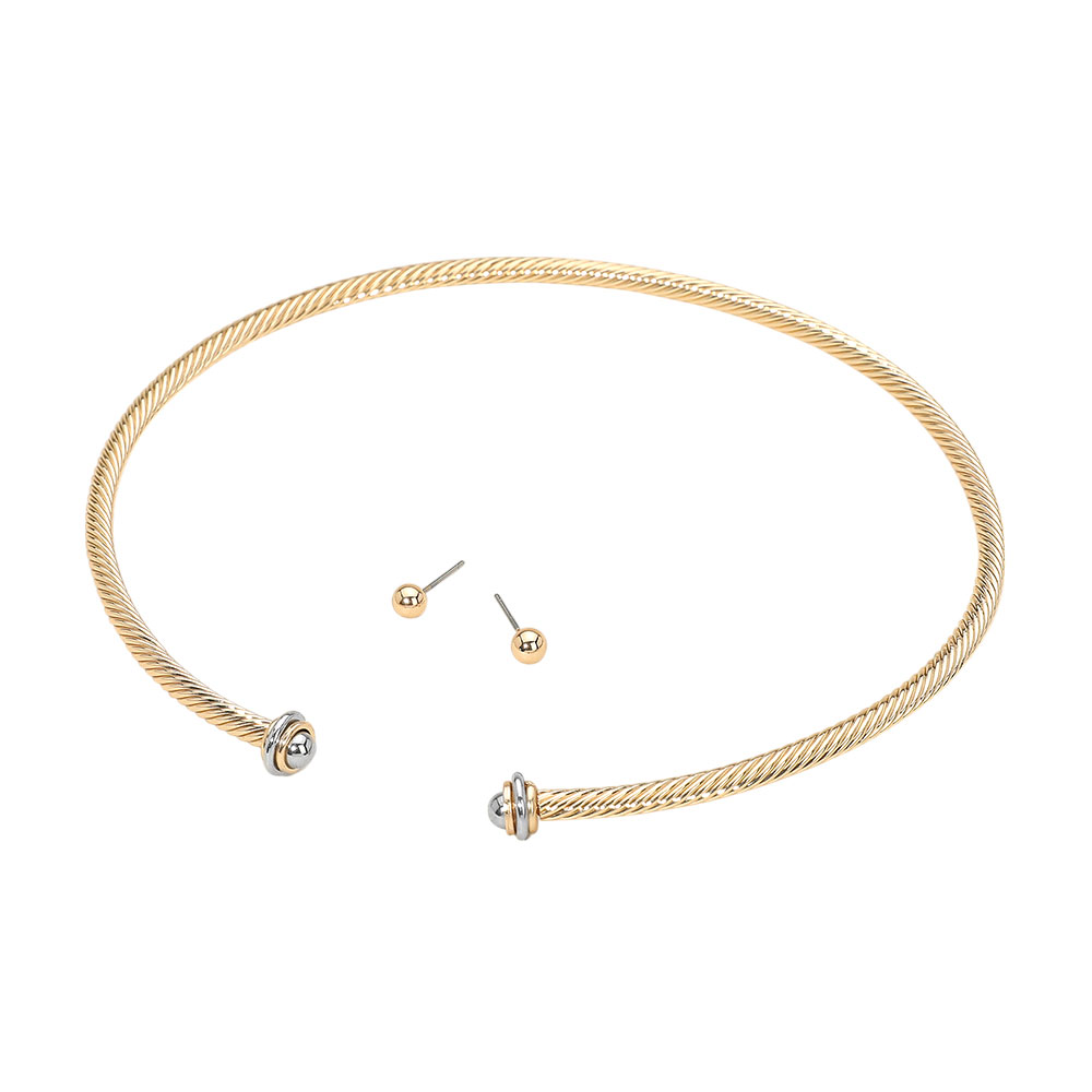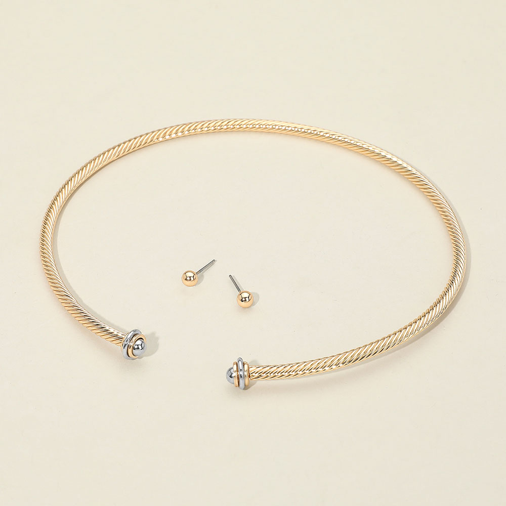 Details • Size : 15" L, 4.75" D • Decor Size : 0.4" L • Earrings Size : 0.1" L • Elegant twisted wire choker necklace set featuring a polished finish and metal ball end caps. Includes matching stud earrings. Perfect for adding modern flair to any outfit. • Lead and Nickel Compliant