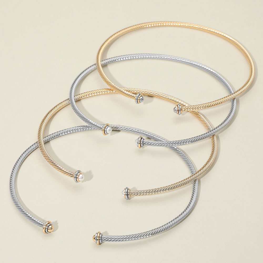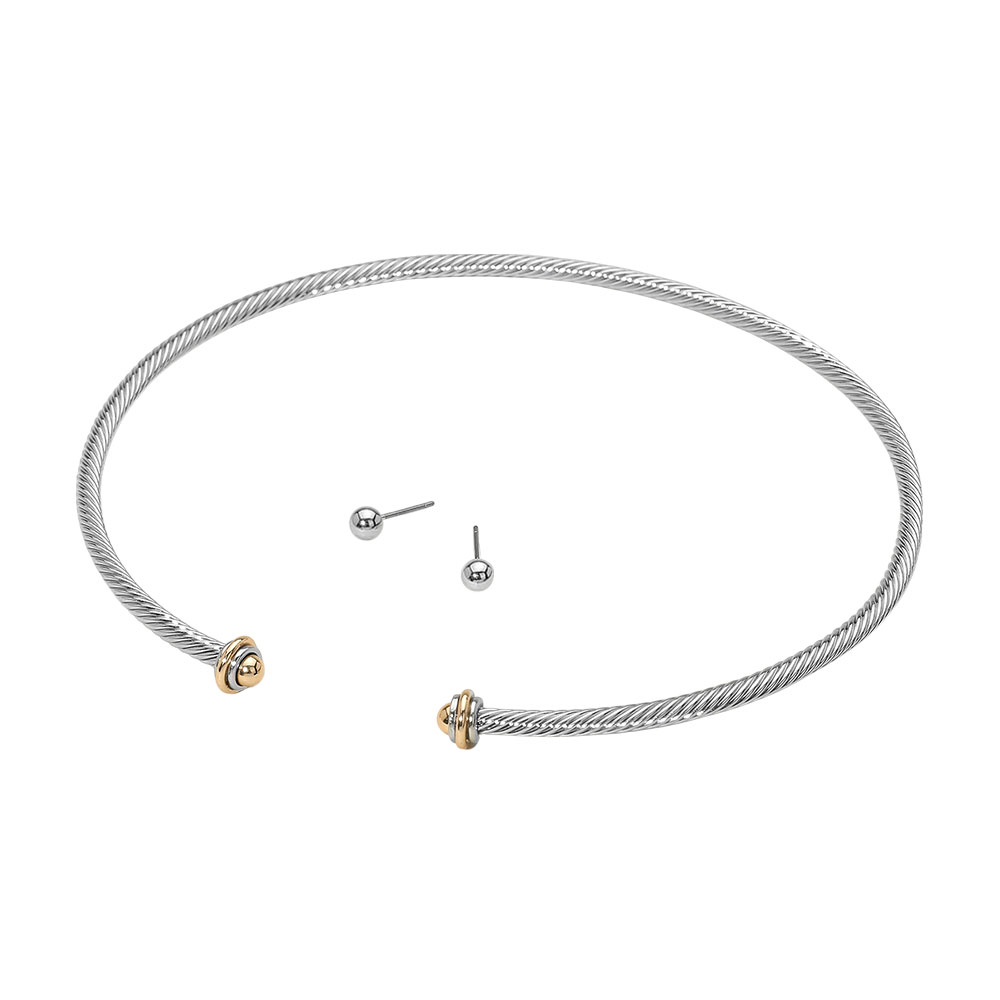 Details • Size : 15" L, 4.75" D • Decor Size : 0.4" L • Earrings Size : 0.1" L • Elegant twisted wire choker necklace set featuring a polished finish and metal ball end caps. Includes matching stud earrings. Perfect for adding modern flair to any outfit. • Lead and Nickel Compliant