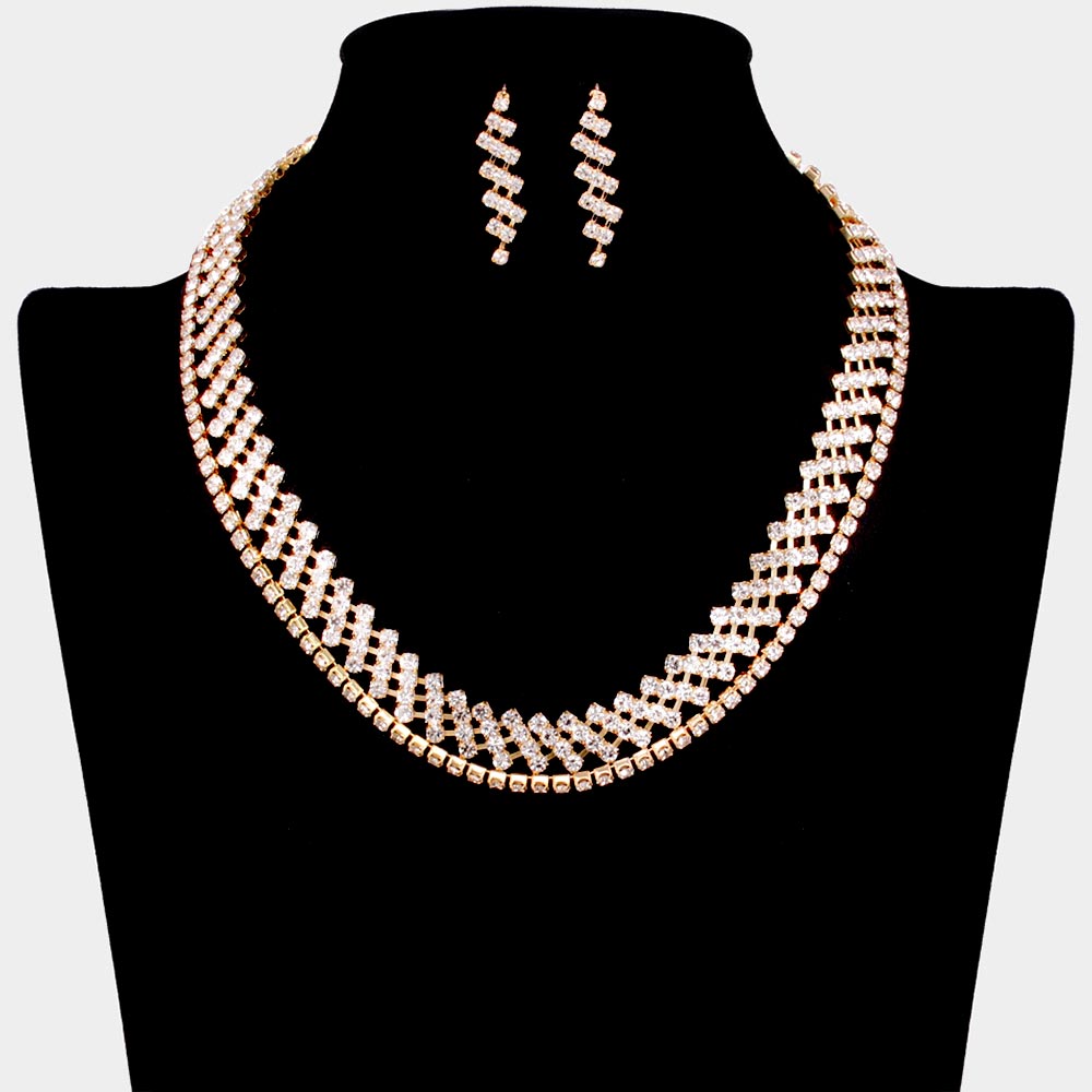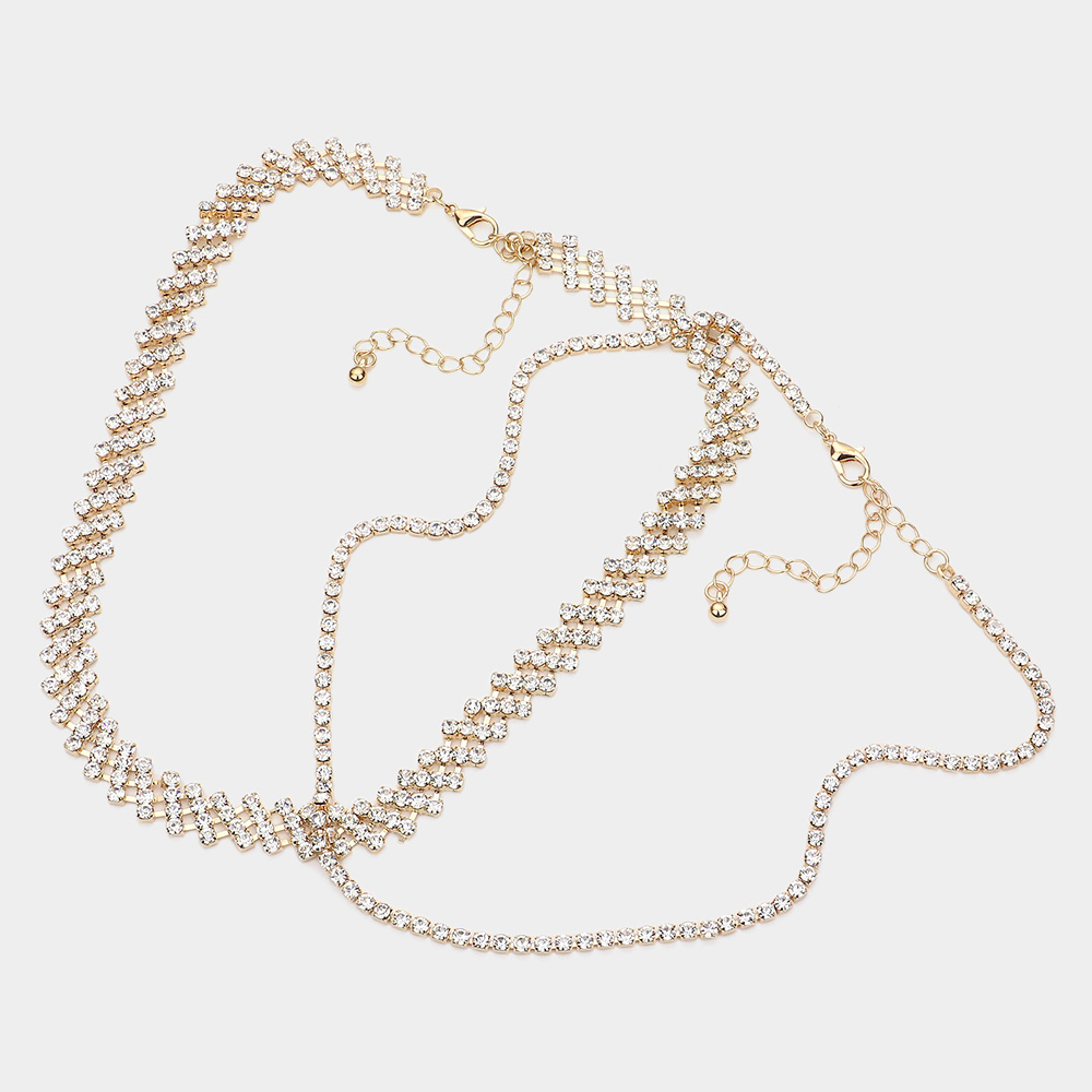 Details • Necklace 1 Size : 16.5" L + 3.25" L • Decor Size : 0.4" L • Necklace 2 Size : 16.25" L + 3" L • Decor Size : 0.1" L • Earrings Size : 1.2" L • Sparkle with sophistication in this crisscross crystal necklace and earring set. Featuring a bold geometric design, this jewelry set is perfect for weddings, evening parties, and special occasions where timeless elegance meets modern glamour. • Lead and Nickel Compliant