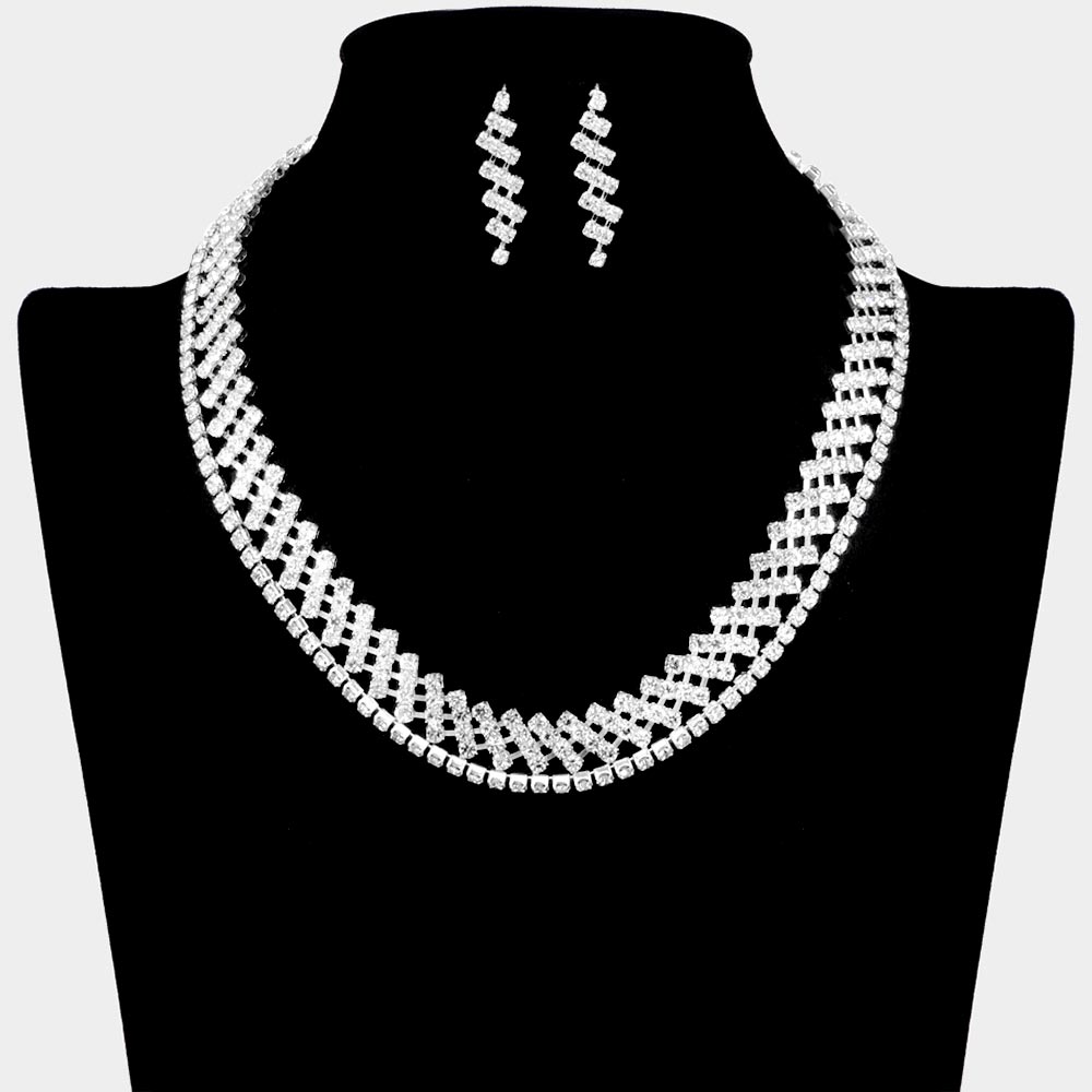 Details • Necklace 1 Size : 16.5" L + 3.25" L • Decor Size : 0.4" L • Necklace 2 Size : 16.25" L + 3" L • Decor Size : 0.1" L • Earrings Size : 1.2" L • Sparkle with sophistication in this crisscross crystal necklace and earring set. Featuring a bold geometric design, this jewelry set is perfect for weddings, evening parties, and special occasions where timeless elegance meets modern glamour. • Lead and Nickel Compliant