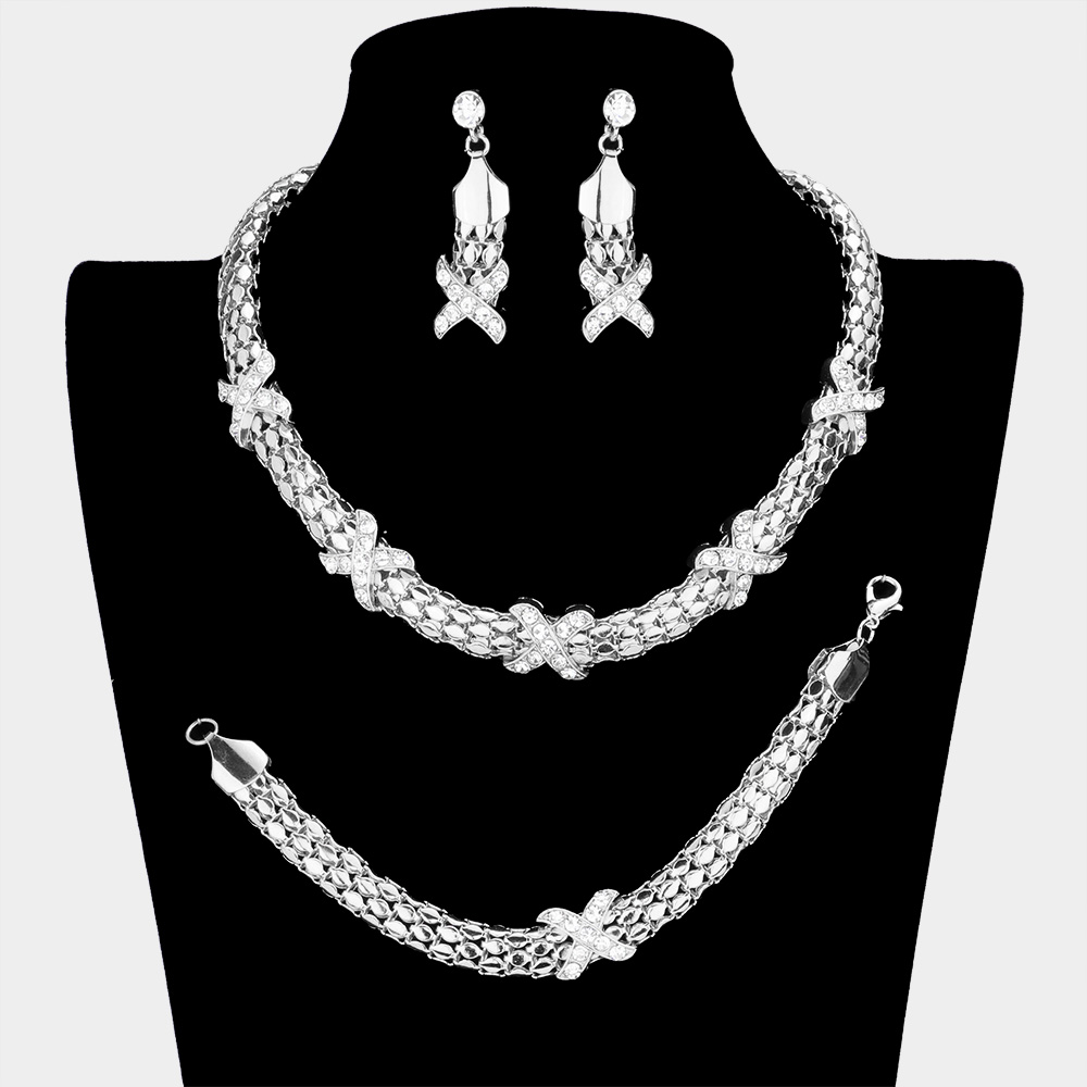 3-PCS Crossed Rhinestone Necklace Jewelry Set