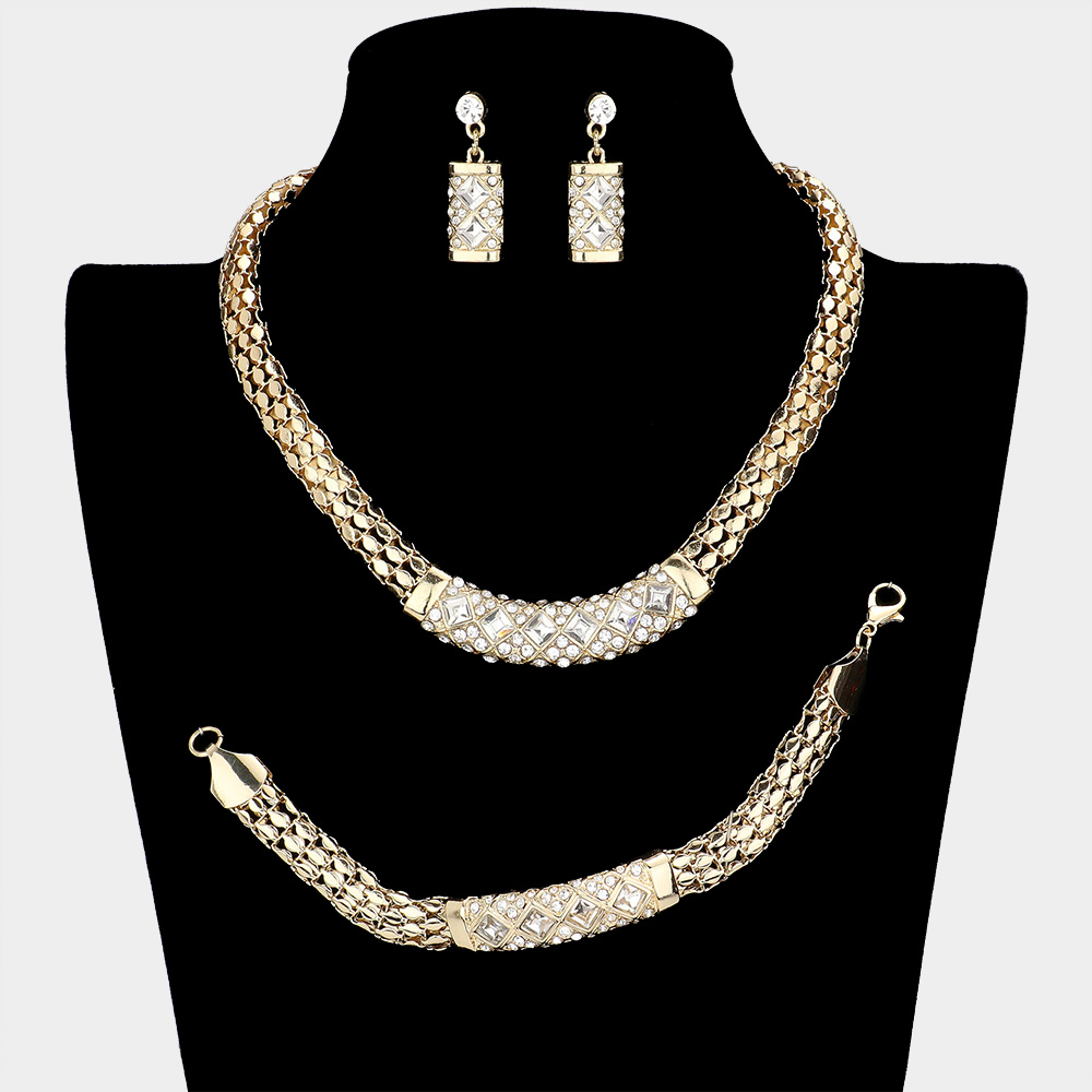 3PCS - Crystal Rhinestone Metal Mesh Necklace Jewelry Set