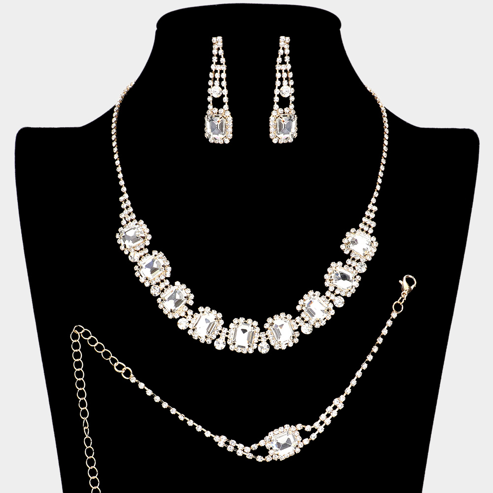 3PCS - Emerald Cut Stone Accented Rhinestone Necklace Jewelry Set