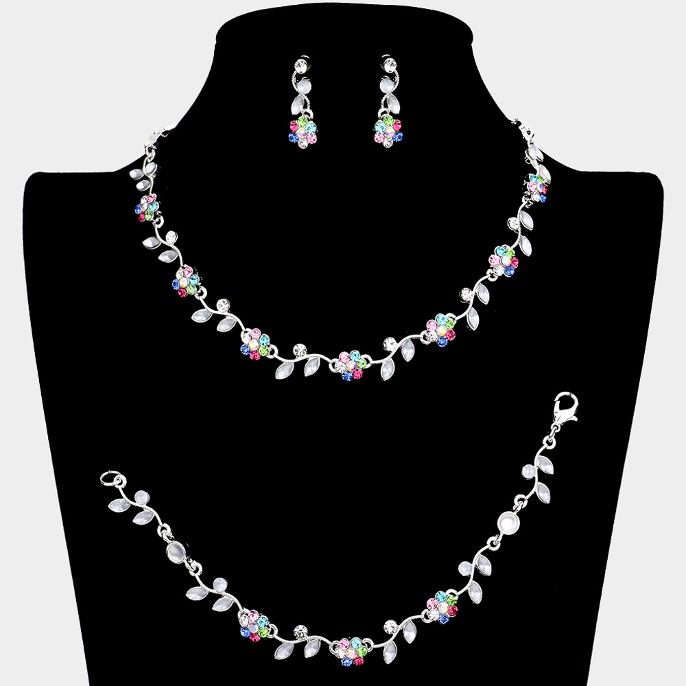 3PCS - Flower Leaf Cluster Rhinestone Necklace Jewelry Set