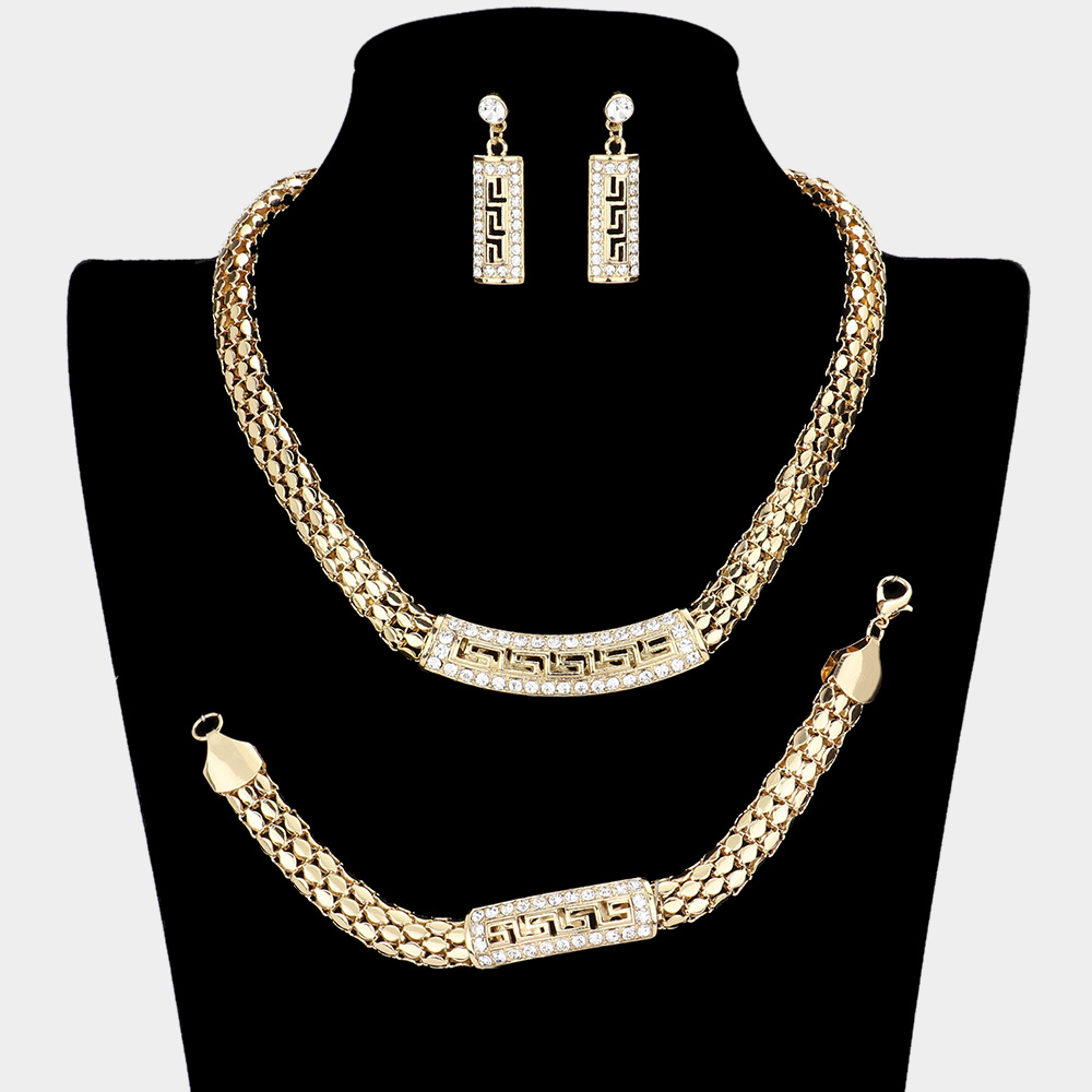 3PCS - Greek Pattern Rhinestone Pave Pendant Accented Mesh Metal Chain Necklace Set