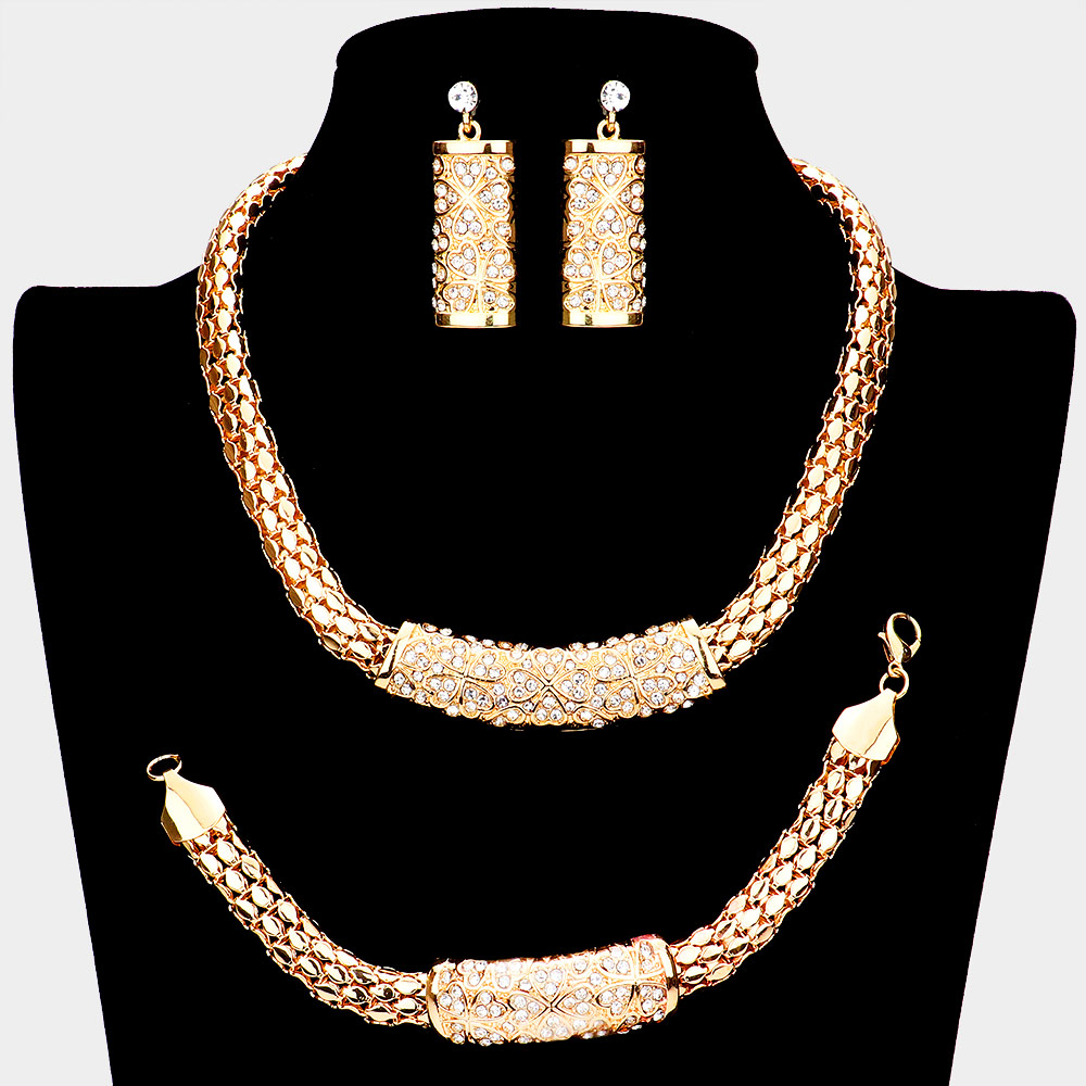 3PCS - Rhinestone Embellished Clover Detailed Necklace Jewelry Set