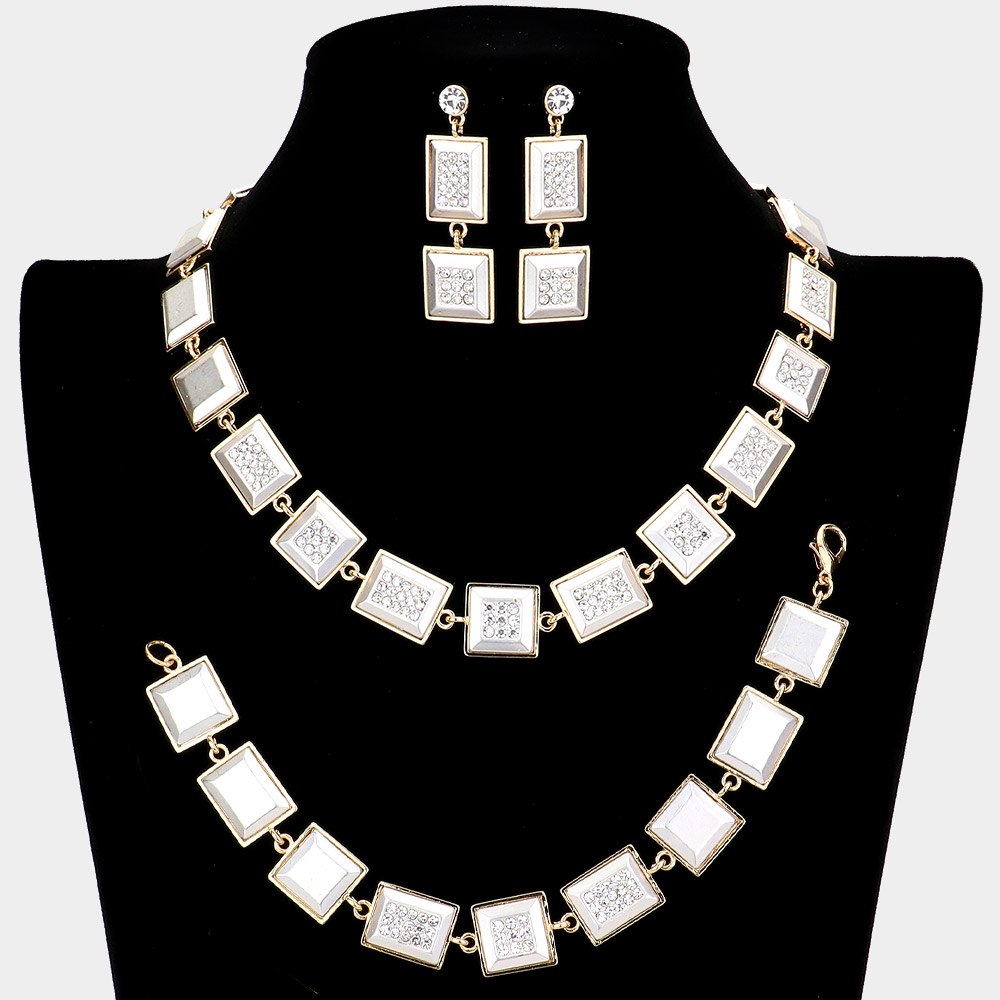 3PCS - Rhinestone Embellished Square Rectangle Link Necklace Jewelry Set