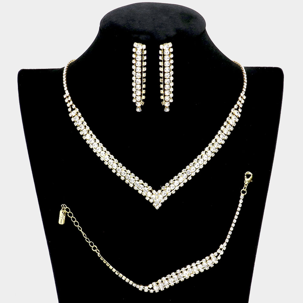 3PCS - Round Stone Detail Rhinestone Necklace Jewelry Set