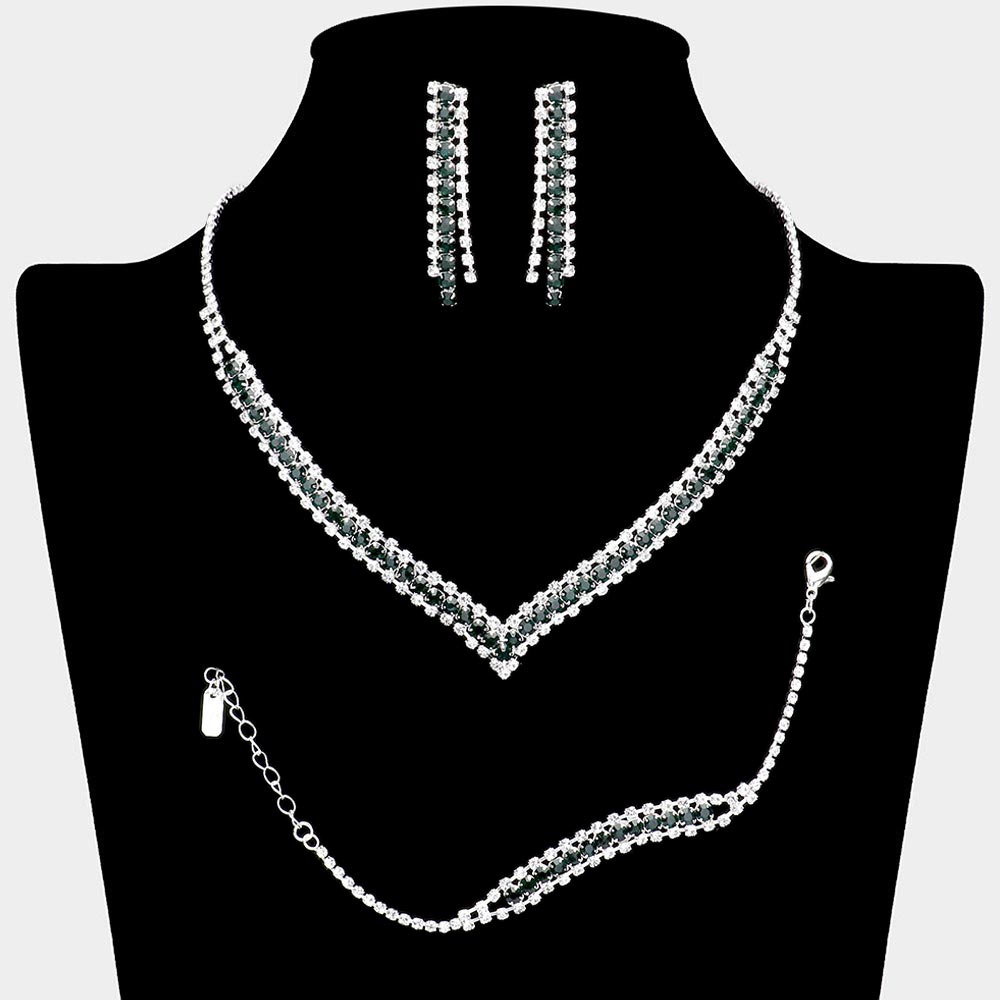 Details • Necklace Size : 16" + 4" L • Decor Size : 0.5" L • Bracelet Size : 0.3" H, 7" + 2" L • Earrings Size : 2" L • Elevate any special occasion with this refined jewelry set featuring a matching necklace, bracelet, and earrings. Its sparkling rhinestone arrangement creates a cohesive, eye-catching look designed to enhance formal outfits with timeless sophistication and graceful shine.