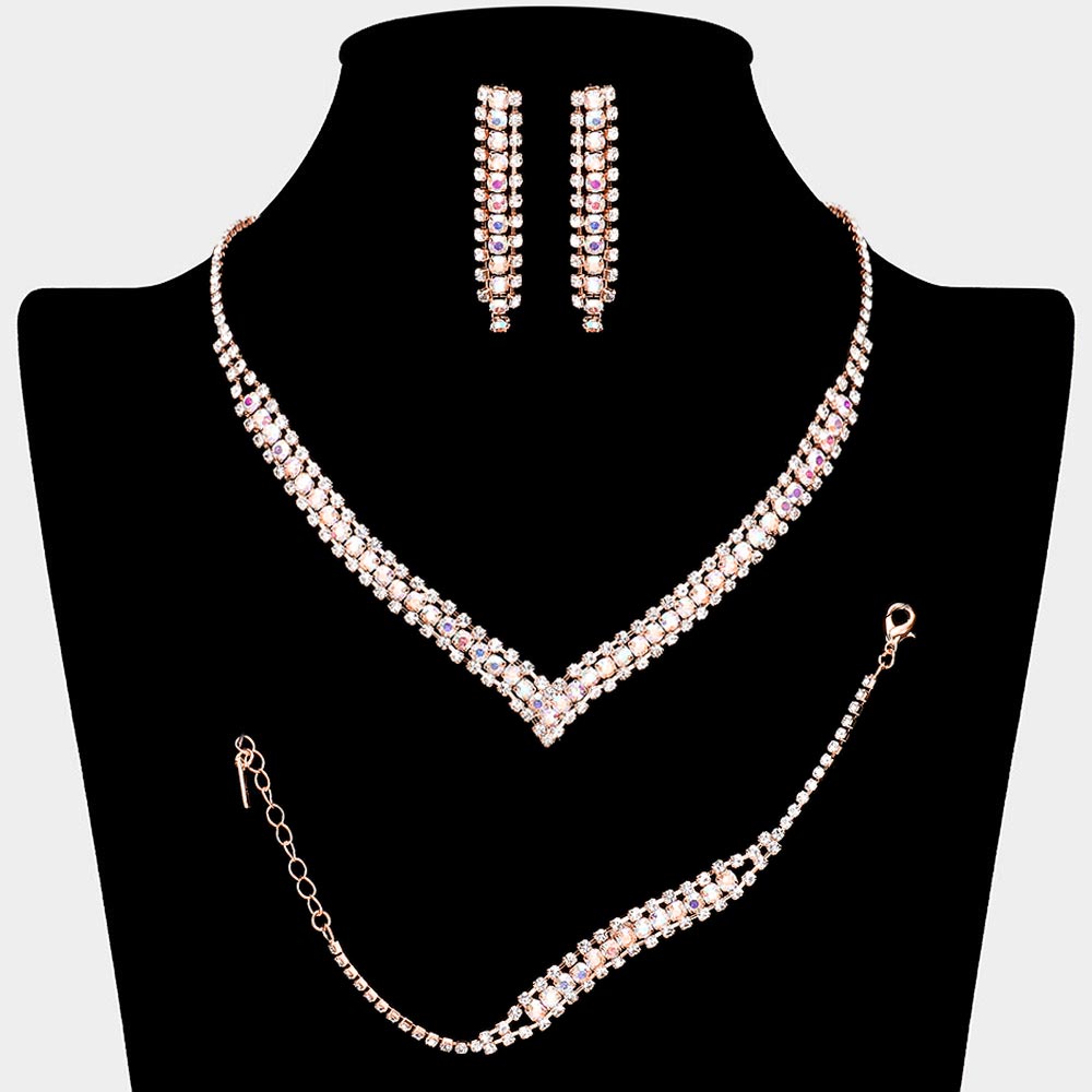 Details • Necklace Size : 16" + 4" L • Decor Size : 0.5" L • Bracelet Size : 0.3" H, 7" + 2" L • Earrings Size : 2" L • Elevate any special occasion with this refined jewelry set featuring a matching necklace, bracelet, and earrings. Its sparkling rhinestone arrangement creates a cohesive, eye-catching look designed to enhance formal outfits with timeless sophistication and graceful shine.