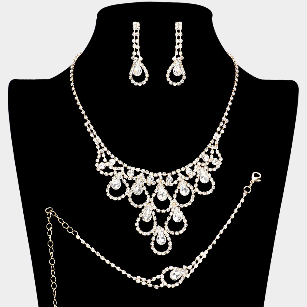 3PCS - Teardrop Stone Accented Rhinestone Necklace Jewelry Set