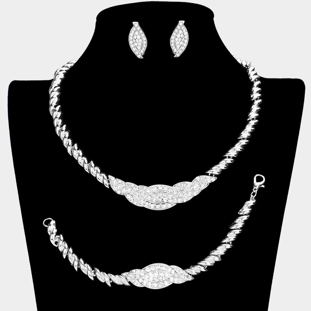 3PCS - Twisted Metal Rhinestone Necklace Jewelry Set
