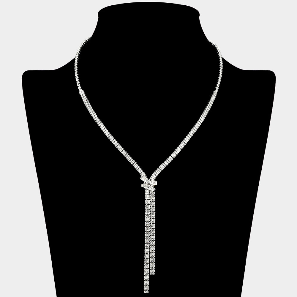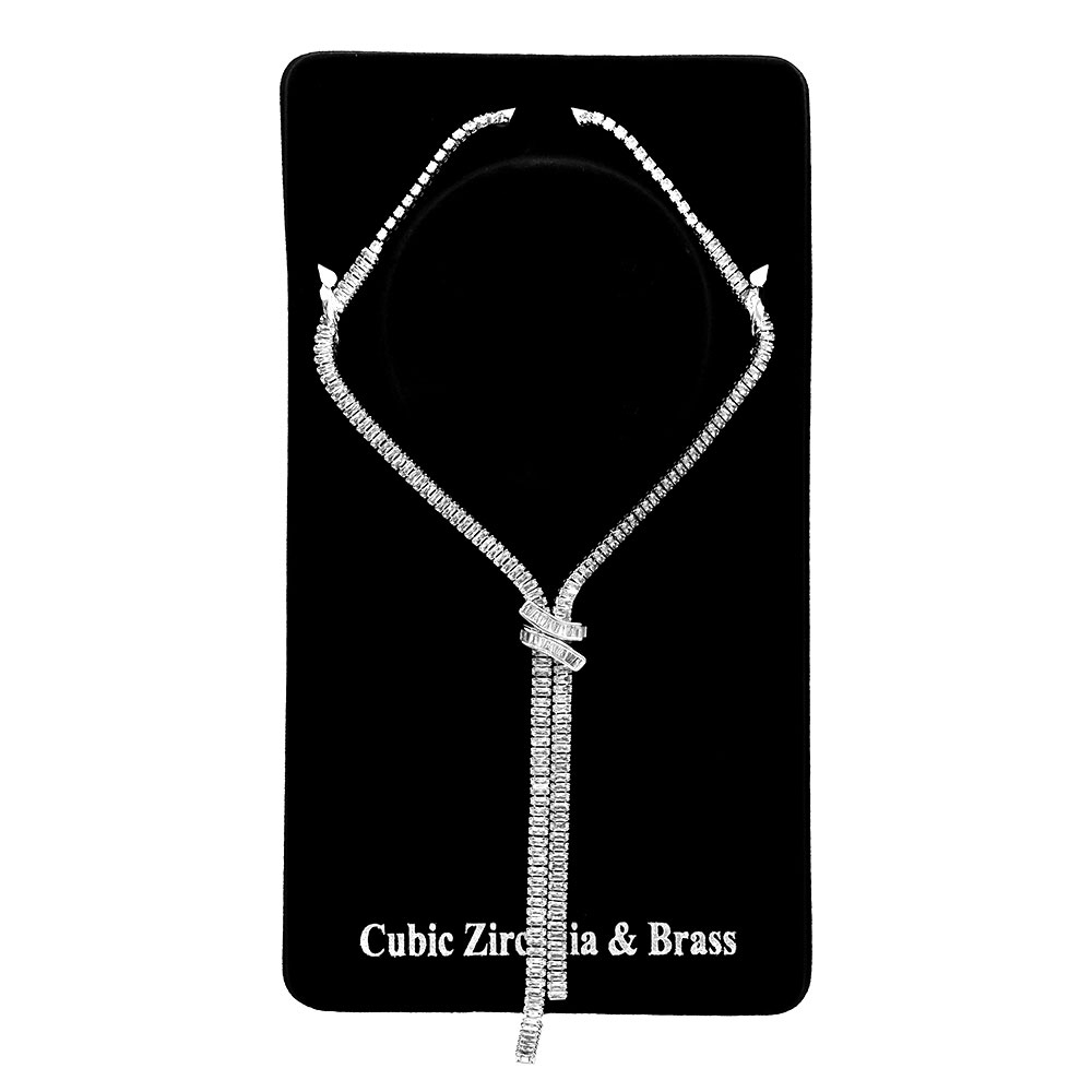 Details • Necklace Size : 16" + 2" L • Decor Size : 3" L • A chic Y-drop necklace featuring a crossover detail with a double-strand tassel drop. Sleek and versatile, this piece adds modern elegance to evening wear, formal looks, and stylish everyday outfits. Perfect for layering or solo statement wear. • Brass • CZ Cubic Zirconia