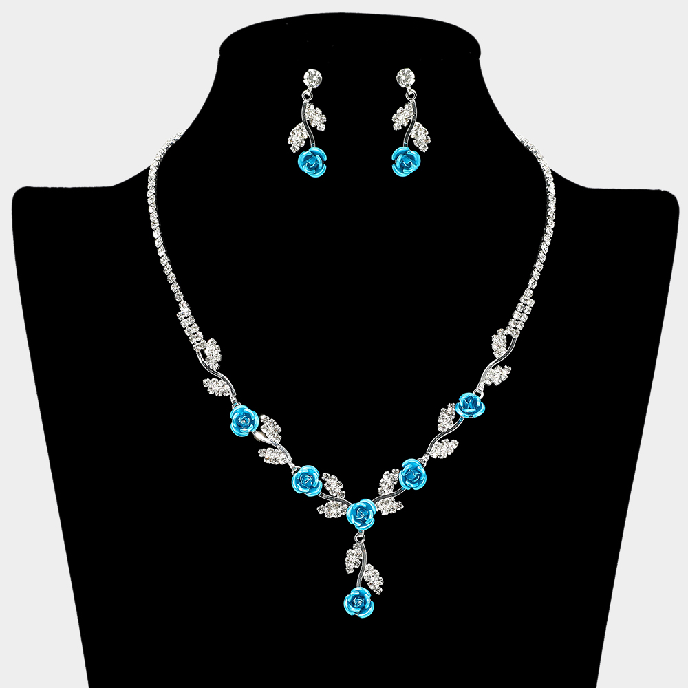 Colored Rose Flower Marquise Stone Cluster Link Rhinestone Paved Necklace