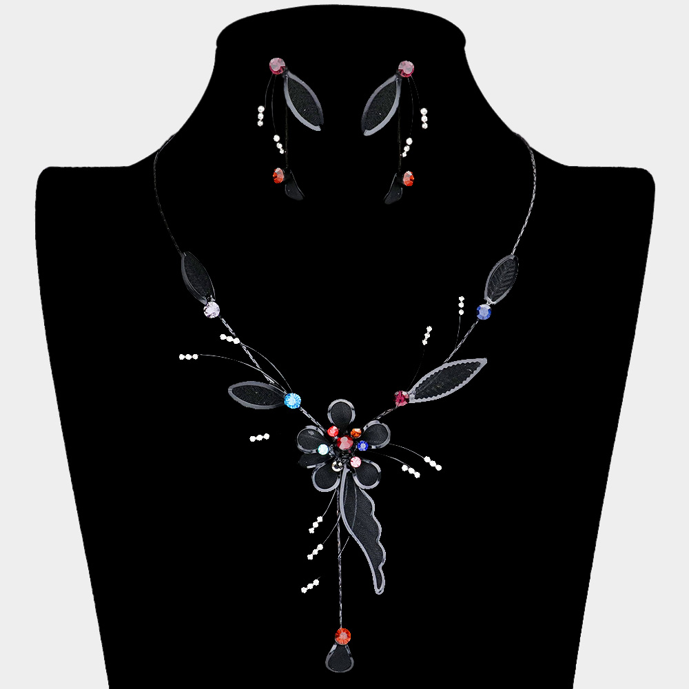 Details • Necklace Size : 16" + 3.5" L • Decor Size : 3.25" L • Earrings Size : 1.8" L • Beautiful floral necklace and earring set designed with delicate flower and leaf accents. Perfect for weddings, parties, and formal occasions, this jewelry set adds timeless elegance and charm to your look. • Lead and Nickel Compliant