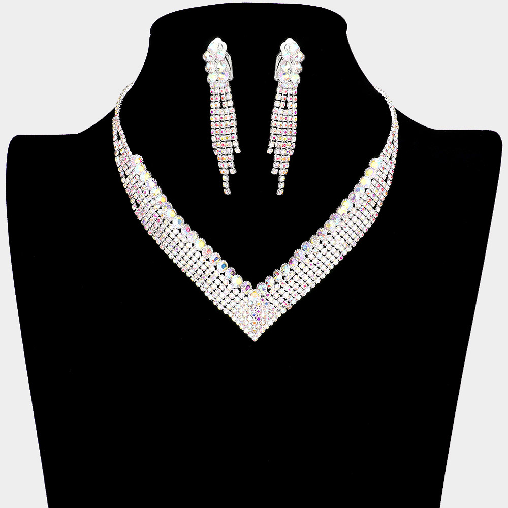 Crystal Rhinestone Pave V Shape Collar Necklace Clip on Earring Set