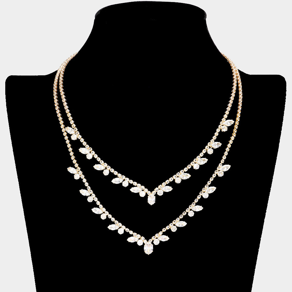 CZ Marquise Round Stone Pointed Rhinestone Paved Double Layered Necklace