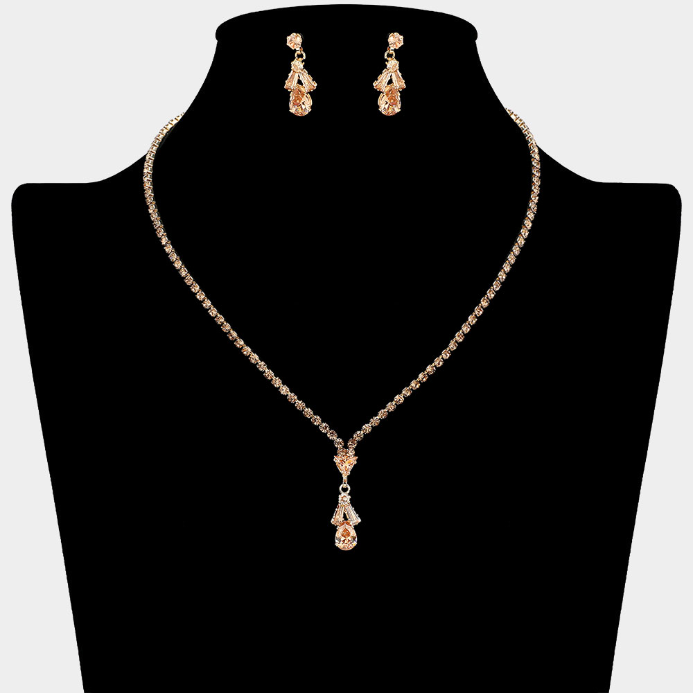 Details • Necklace Size : 15" + 4.75" L • Decor Size : 1" L • Earrings Size : 1" L • Crystal necklace and matching earrings featuring elegant teardrop pendants and a delicate chain. Perfect for formal occasions, weddings, or evening wear, this set adds refined sparkle and grace. • CZ Cubic Zirconia