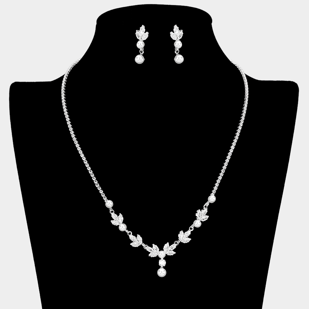 Details • Necklace Size : 17.5" + 4.25" • Decor Size : 0.9" L • Earrings Size : 1" L • Add refined charm to any formal look with this delicate jewelry set featuring a graceful arrangement of sparkling accents and classic pearl drops. The matching earrings and necklace bring a polished finish to bridal styles, evening wear, and special celebrations, creating a timeless, graceful impression. • CZ Cubic Zirconia • Lead and Nickel Compliant