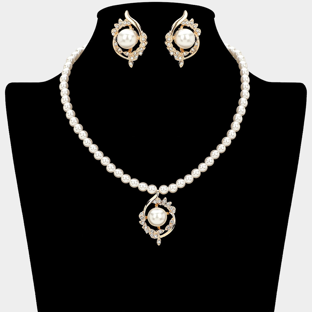 Details • Necklace Size : 15.5" + 3.75" L • Pendant Size : 1" X 1.4" • Earrings Size : 1.4" L • Graceful jewelry set featuring a pearl strand necklace with a sparkling pendant and matching earrings. Ideal for formal occasions, weddings, or adding refined charm to evening wear.