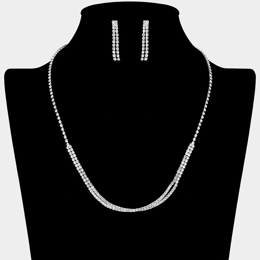 • Refined jewelry set featuring a sleek dual-strand rhinestone necklace paired with matching linear drop earrings. The necklace’s layered contour and minimalist symmetry create an elegant silhouette, perfect for formal events or evening attire.