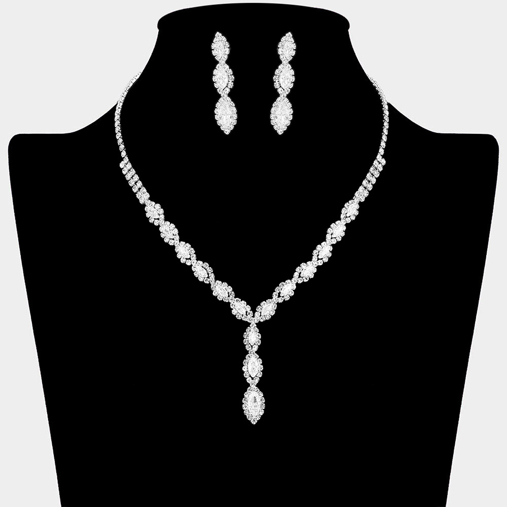 Details • Necklace Size : 14" + 5" L • Decor Size : 1.7" L • Earrings Size : 1.5" L • Dazzling jewelry set featuring a V-shaped CZ stone necklace with marquise-cut clusters and matching drop earrings. Its symmetrical layout and elongated teardrop silhouette bring timeless elegance to evening, bridal, or formal looks. • CZ Cubic Zirconia • Lead and Nickel Compliant