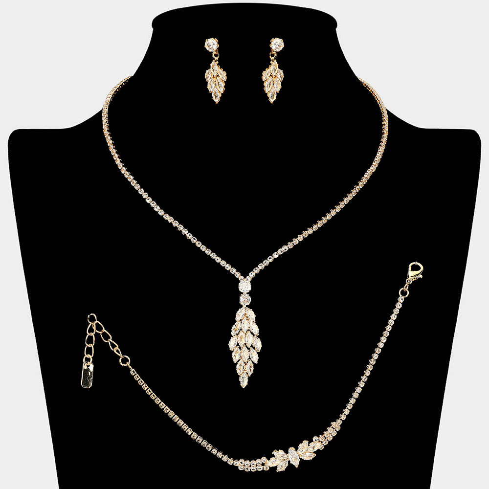 Details • Necklace Size : 16" + 4" L • Decor Size : 1.75" L • Bracelet Size : 0.4" H, 7" + 2" L • Earrings Size : 1.1" L • This exquisite jewelry set features a sparkling leaf-inspired necklace, matching bracelet, and elegant drop earrings. Designed with shimmering crystals and a gold-tone finish, it adds a refined and radiant touch, perfect for weddings, formal events, or sophisticated evening wear. • CZ Cubic Zirconia