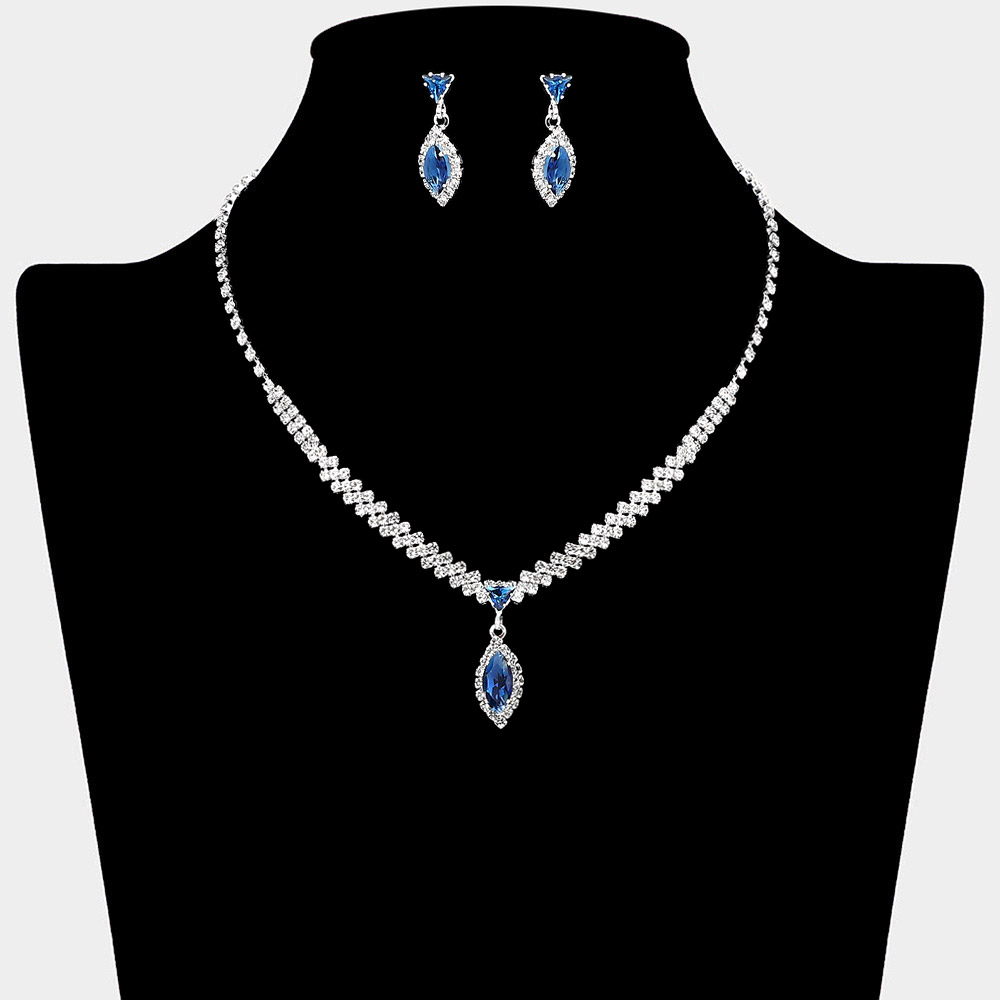 Details • Necklace Size : 14" + 5" L • Decor Size : 1.2" L • Earrings Size : 1" L • Elegant jewelry set featuring a crystal teardrop pendant necklace with matching earrings. The sparkling rhinestone accents and refined setting create a timeless look, perfect for weddings, evening events, or adding sophistication to any formal outfit. • CZ Cubic Zirconia • Lead and Nickel Compliant