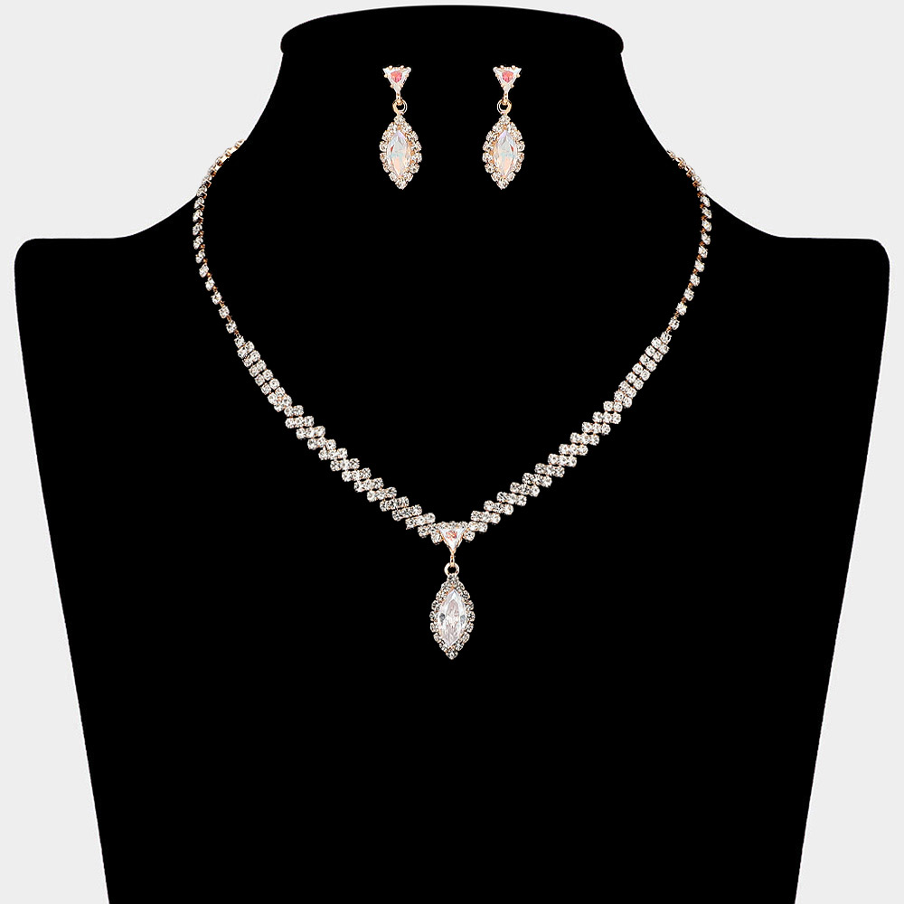 • Elegant jewelry set featuring a crystal teardrop pendant necklace with matching earrings. The sparkling rhinestone accents and refined setting create a timeless look, perfect for weddings, evening events, or adding sophistication to any formal outfit.