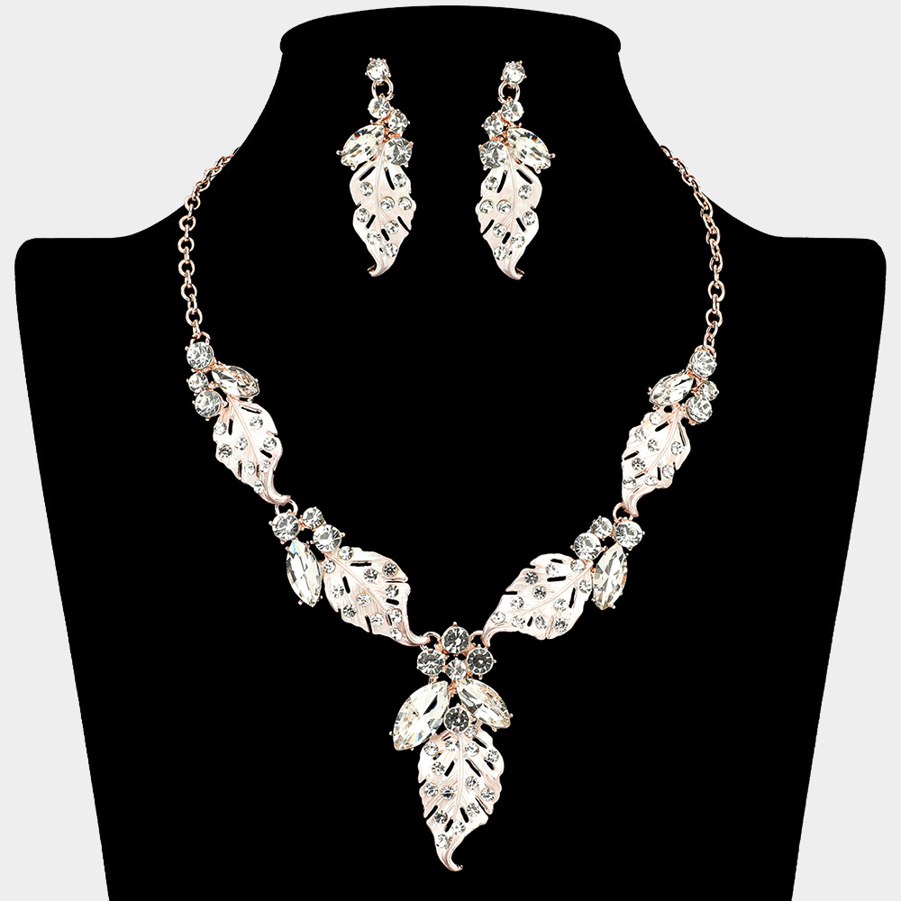 Marquise Round Stone Cluster Colored Metal Leaf Embellished Necklace
